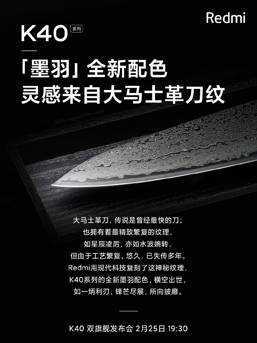 Das Redmi K40 wird ja diese Woche am Donnerstag enthüllt, schon jetzt zeigt Xiaomi auf seiner Weibo-Seite stolz das Design der Rückseite, die ja bereits vor einigen Tagen in einem aufgehellten Teaserbild zur Kamera mit einer sehr interessanten und dekorativen Struktur aufgefallen ist. Diese ist, laut Xiaomi, von Damaststahl (auch Damaszener Stahl genannt, siehe Wikipedia) inspiriert und aufgrund seiner Musterung unter Sammlern besonders beliebt.