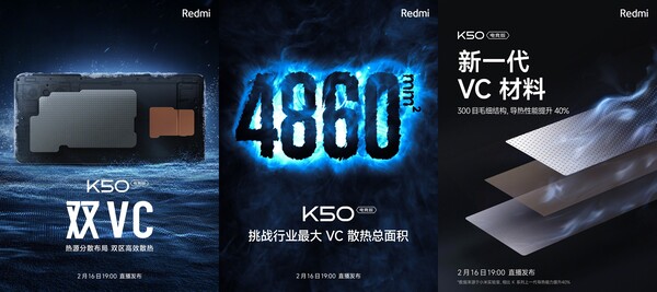 Auf den Teaserbildern ist unter anderm das sehr groß ausgelegte und mehrlagige Coolingpad zu sehen, das Xiaomi für den Snapdragon 8 Gen 1 seinen Gamingboliden Redmi K50 Gaming Edition einsetzen wird. Das Redmi K50 Vapor Chamber (VC) Cooling System hat als "Dual VC" eine aktive Gesamtfläche von 4.860 mm² und soll viel effizienter arbeiten, als vergleichbare Kühllösungen für Smartphones. Außerdem soll sich der 4.700-mAh-Akku des Redmi K50 Pro dank 120-Watt-Schnellladesystem in nur 17 Minuten voll auftanken lassen.