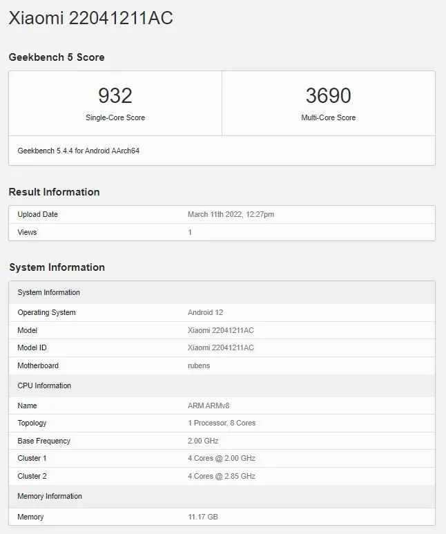 Benchmark ist auch ein gutes Stichwort. Denn das Redmi K50 Pro, also das mittlere Modell der K50 Serie, wurde unter seiner erwarteten Modellnummer 22041211AC bei Geekbench gesichtet. Der dortige Eintrag zeigt 932 Single-Core-Punkte und 3.690 Punkte beim Multi-Core-Score für den bereits bestätigten neuen MediaTek Dimensity 8100 SoC mit bis zu 2,85 GHz Taktrate sowie der Arm Mali-G610 MC6 GPU mit HyperEngine 5.0. Dazu werden 12 GB RAM sowie Android 12 genannt.