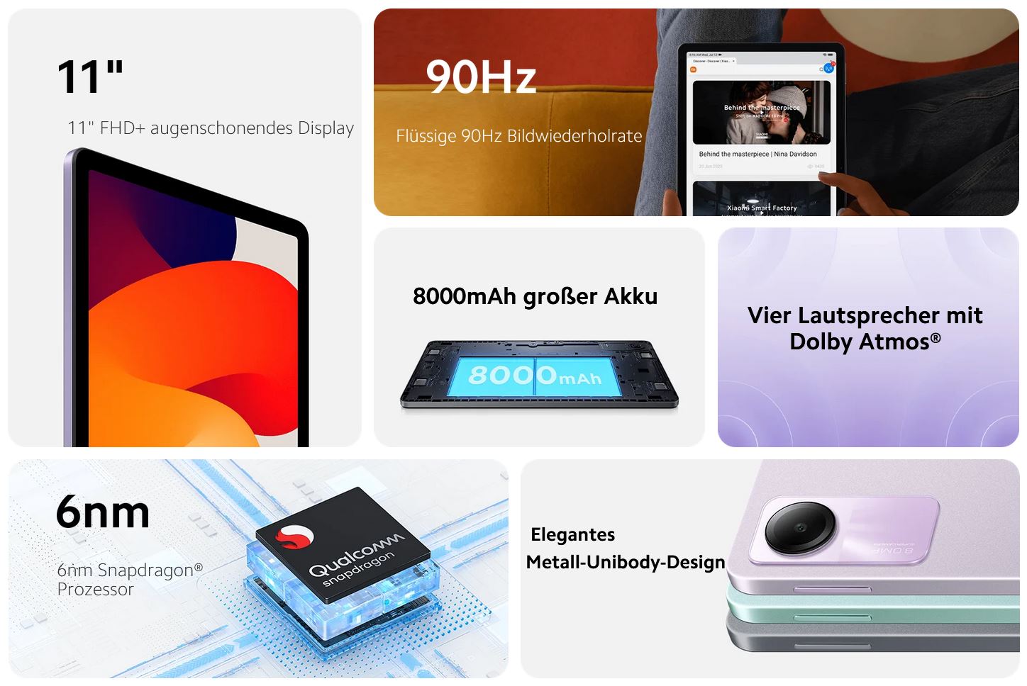 In der Foto- und Videoabteilung warten eine 8 MP Hauptkamera sowie eine 5 MP Selfie-Cam samt AI Face Unlock auf ihren Einsatz. Beide können Videos in 1080p mit 30 fps aufzeichnen. In dem Unibody-Design aus Aluminiumlegierung bringt der Hersteller zudem einen 8.000 mAh großen Akku mit 10 W Ladetempo und vier Lautsprecher mit Dolby Atmos unter. Als Betriebssystem ist MIUI Pad 14 basierend auf Android 13 im Einsatz.