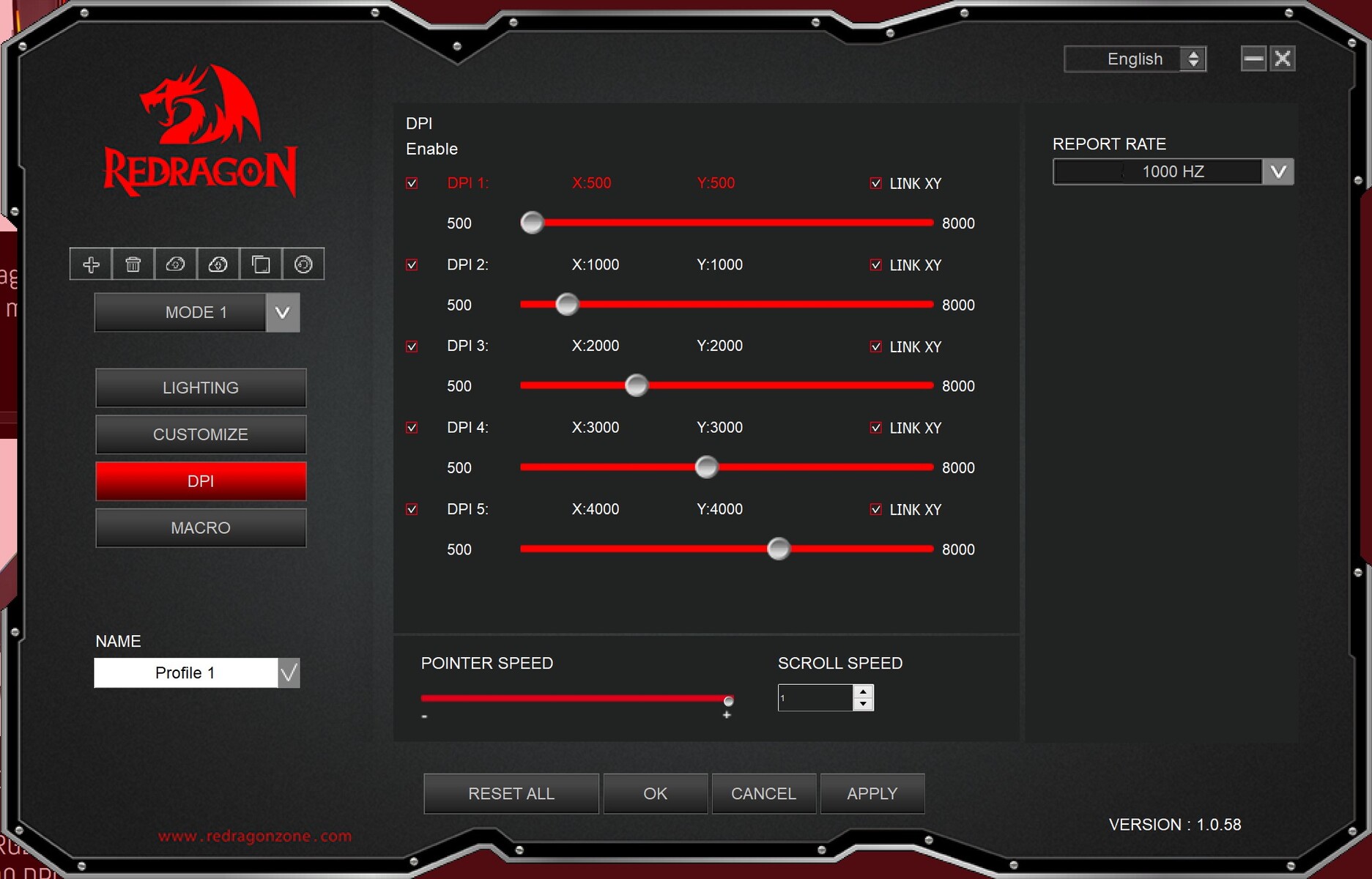 Die Maus-Software bietet neben neun RGB-Effekten, die auch über die hinterste Taste oben an der Maus durch gewechselt werden können, die Möglichkeit Makros zu definieren, sowie die DPI- und Refresh-Werte anzupassen, etwa für den Office-Betrieb und Gaming. Die insgesamt fünf DPI-Modi lassen sich teils deaktivieren, um nicht durch alle durchwechseln zu müssen, falls man lediglich zwei Modi benötigt.