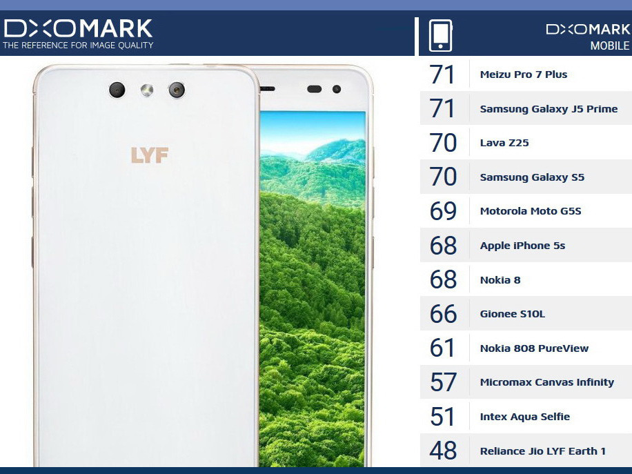 Das Reliance Jio LYF Earth 1 verfügt laut Hersteller über ein Kameramodul, das einen Bildsensor vom Typ Sony Exmor-R als Pixelbasis nutzt. Im Falle des LYF Earth 1 hat der Nutzer davon allerdings nur einen klangvollen Namen in der Beschreibung des Smartphones. Insgesamt enttäuscht die Bildqualität des integrierten Smartphone-Kameramoduls sowohl bei Foto- als auch Videoaufnahmen. Im Test von DxOMark Mobile verschenkte das Reliance Jio LYF Earth 1 in den Testparcours von Foto und Video mit einem ungenauen Autofokus, einem sehr begrenzten Dynamikumfang und zahlreichen Bildfehlern (Helligkeits- und Farbrauschen, Blaustich, Farbsäume) wertvolle Punkte. Mit einem Gesamtscore von 48 Punkten landet das Reliance Jio LYF Earth 1 hinter Micromax Canvas Infinity (57 Punkte) und Intex Aqua Selfie (51) auf dem letzten Platz.
