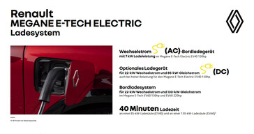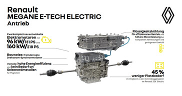 Für den Megane E-Tech Electric stehen zwei neu entwickelte Elektromotoren mit Flüssigkeitskühlung zur Wahl, die 96 kW (131 PS) respektive 160 kW (218 PS) leisten. Im Vergleich zum Antrieb im Renault Zoe Electric benötigen die E-Motoren für den Megane 45 Prozent weniger Platz im Fahrzeug und benötigen als fremderregte Drehstrom-Synchronmotoren keine Seltenerdmetalle für Magnete. Das Bordladesystem des Megane E-Tech Electric ist für 22-kW-Wechselstrom und 85-kW (EV 40)- respektive 130-kW (EV 60)-Gleichstrom ausgelegt.