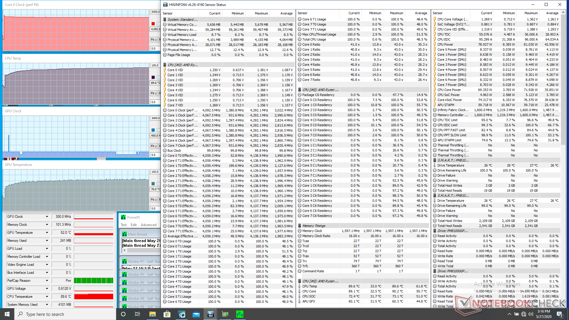Darüber hinaus schlägt das RP-15 laut unseren Stresstestdaten das Sky X4C um 4%, während es ungefähr 40% weniger Strom verbraucht (ca. 70 Watt beim RP-15 gegenüber ca. 120 Watt beim X4C). Diese Kluft beim Stromverbrauch ist enorm und macht die Vorteile der Effizienz des Zen 2 nur noch deutlicher. Natürlich gilt es zu berücksichtigen, dass der Intel Core i9-9900KS, der im Sky X4C verwendet wird, ein Desktop-Prozessor ist und nicht aus Effizienzgründen im Gehäuse steckt. Trotzdem ist es beeindruckend, die Leistung eines so schlanken Laptops wie des RP-15 von Eluktronics auf dem Niveau eines Desktop-Prozessors zu sehen. Interessant wäre auch der Stromverbrauch des Zephyrus G14, aber leider stehen uns diese Daten nicht zur Verfügung.