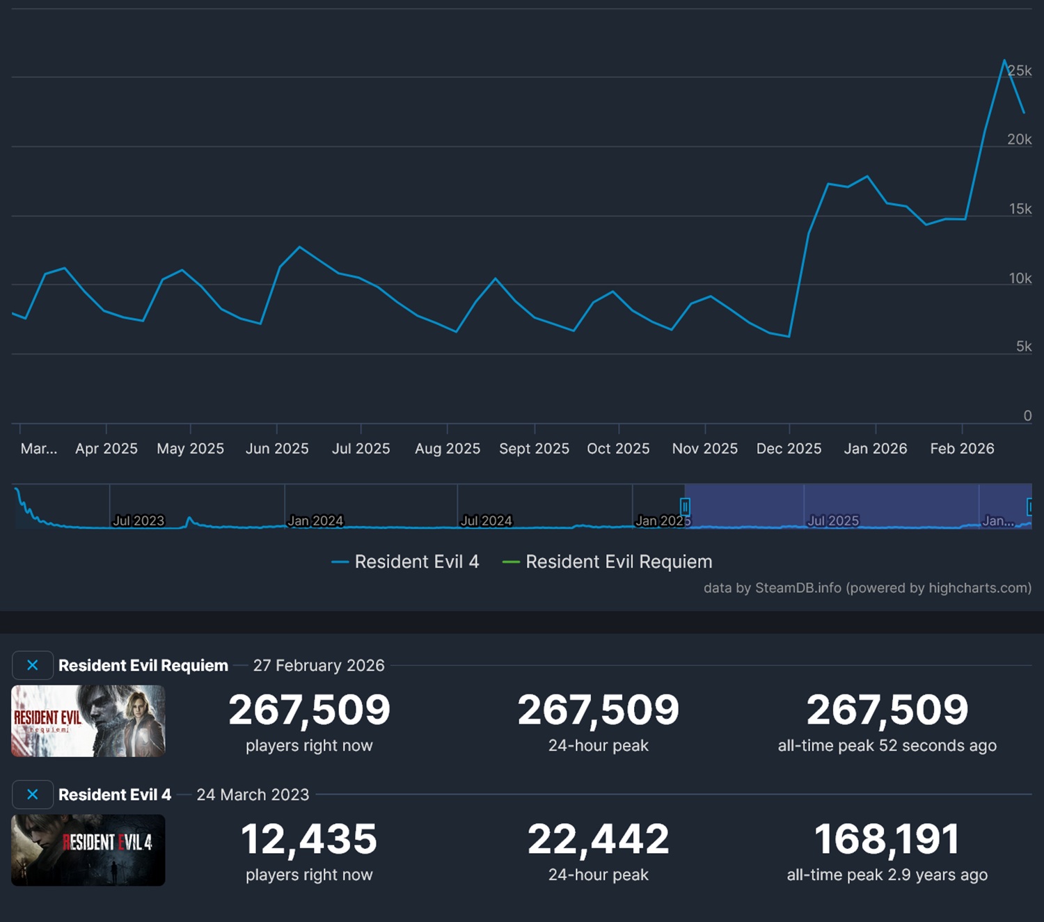 Zum Vergleich: Der vorherige Hauptteil der Reihe, Village, erreichte im Jahr 2021 einen Spitzenwert von über 106.000 Spielern. Die Remakes von RE2 und RE3 blieben hinter dem achten Teil zurück, während RE7 im Jahr 2017 lediglich die 20.000er-Marke knackte. Capcom hat zudem den Survival-Horror-Konkurrenten Konami förmlich überflügelt: Sowohl Silent Hill f als auch das Silent Hill 2-Remake blieben unter der Marke von 25.000 gleichzeitigen Spielern.