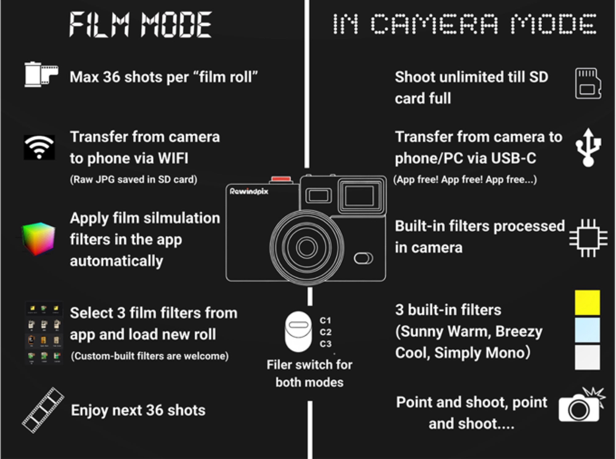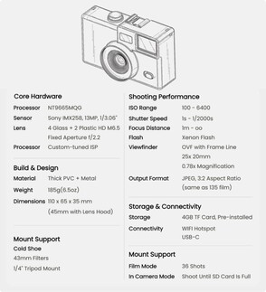 Zweitens können über die zugehörige Smartphone-App virtuelle Filmrollen eingelegt werden, die einen Filter und eine begrenzte Anzahl an Fotos freischalten. Die Fotos können erst angesehen werden, wenn die ganze Filmrolle auf das Smartphone übertragen wird, wofür die Kamera WLAN unterstützt. Auf Wunsch kann dieser "Film-Modus" auch deaktiviert werden. Ein 1 Zoll Display auf der Rückseite der 185 Gramm leichten Kamera zeigt Details zum Akku und zum verfügbaren Speicher an. Eine 4 GB microSD-Karte befindet sich im Lieferumfang.