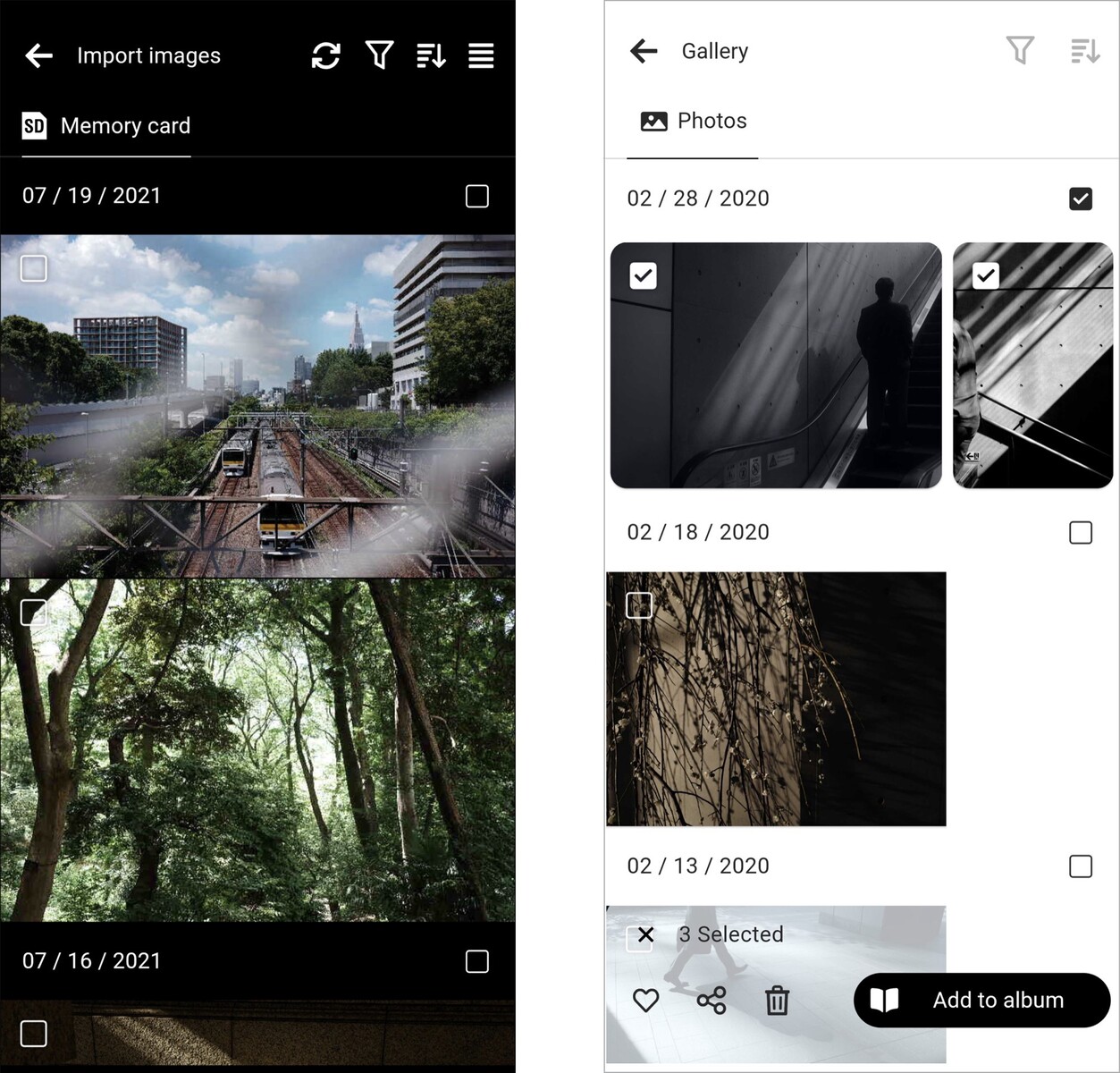 Die wohl nützlichste Funktion von Ricoh GR World ist aber die Möglichkeit, Fotos und Videos drahtlos von der Ricoh GR Kamera auf das Smartphone zu übertragen, wobei sowohl JPEG- als auch RAW-Dateien separat gespeichert werden können. Die App sortiert Fotos nach Aufnahmedatum und zeigt ein Icon an, wenn ein Bild schon übertragen wurde.