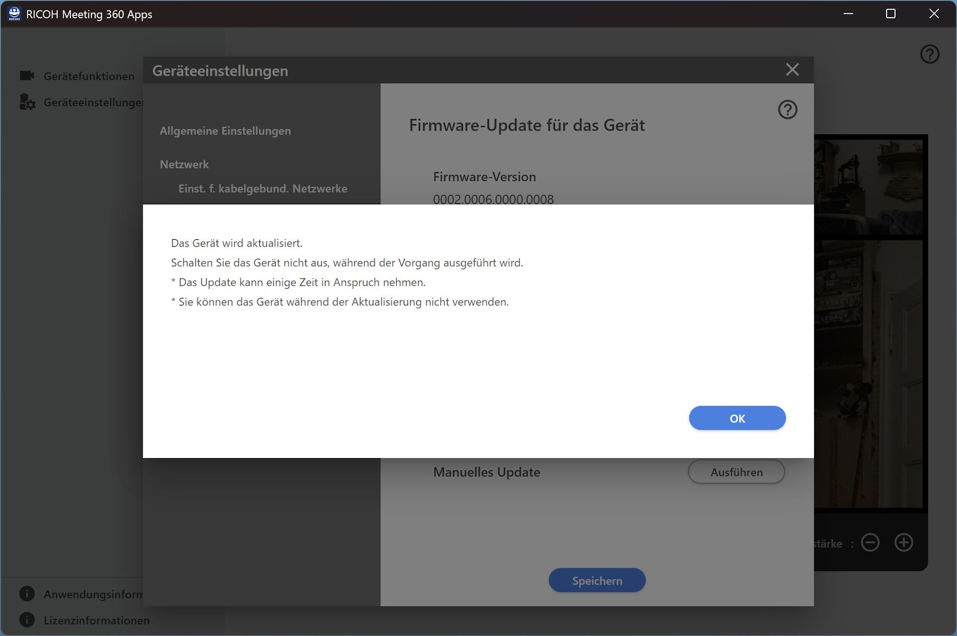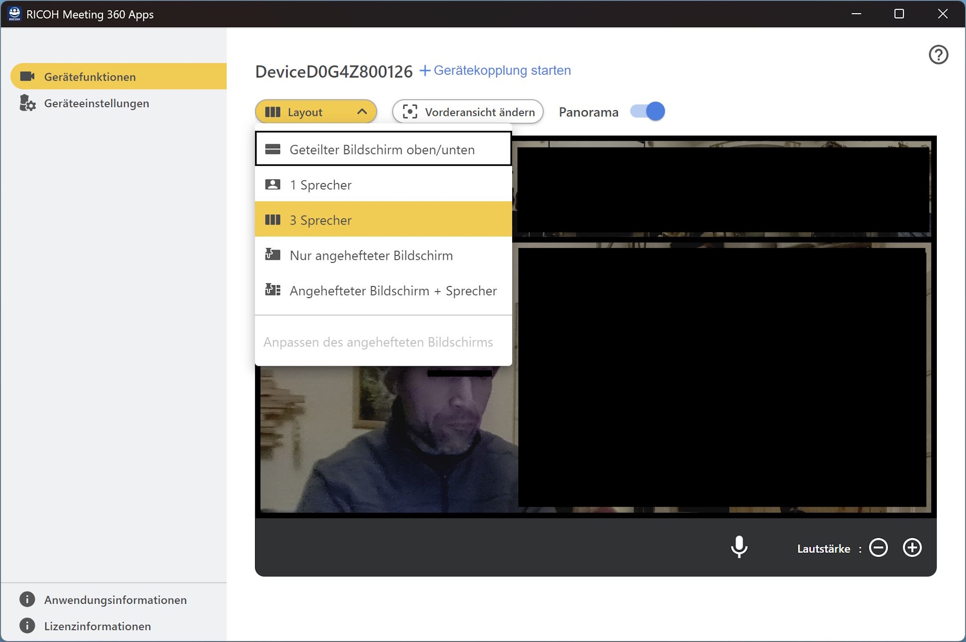 Dazu gibt es die Ricoh Meeting 360 App. Hier kann man dann Firmware-Upgrades anstoßen (das Gerät vorher per LAN-Kabel verbinden), Layout-Vorlieben konfigurieren und andere Einstellungen vornehmen.