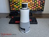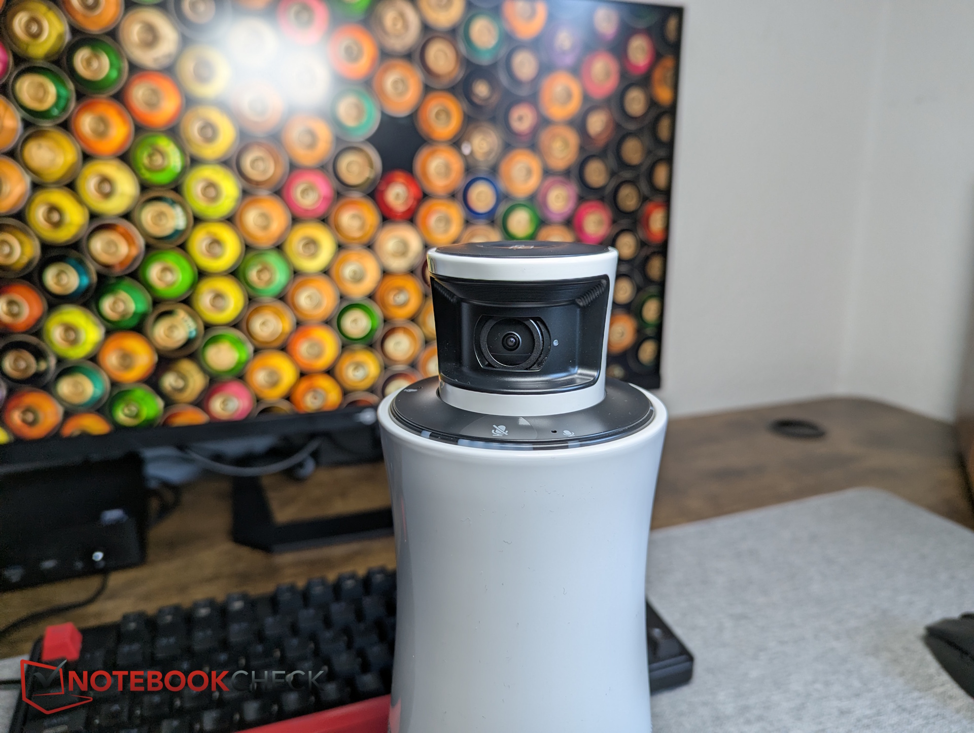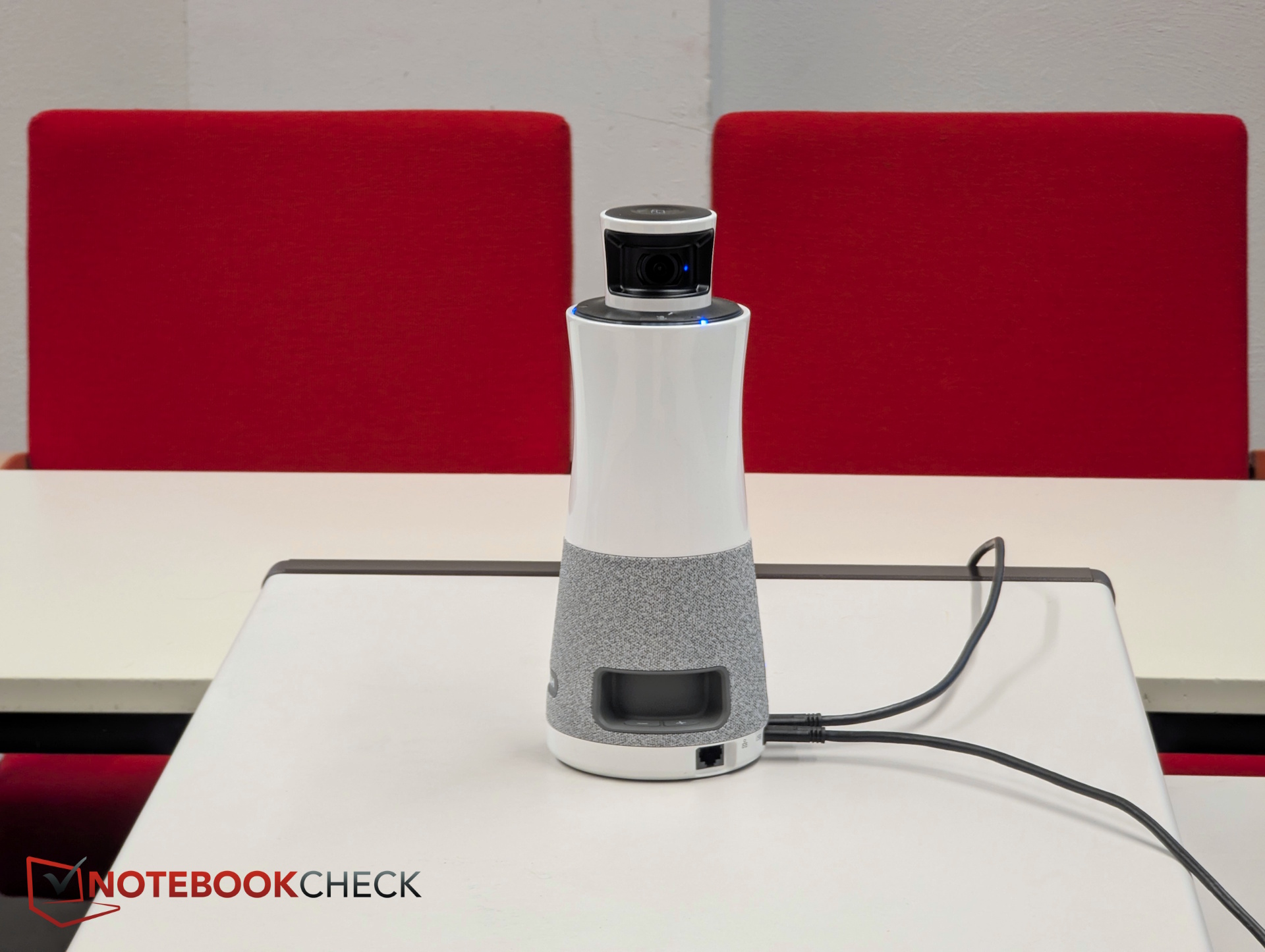 Im säulenförmigen Kunststoff-Gehäuse sitzen ganz oben die beiden 180-Grad-Kameras, was Sinn ergibt, so ragen sie über etwaige Laptopbildschirme etc. hinweg und kommen zumindest in die Nähe der Augenhöhe, ohne jedoch den Blick der Anwesenden aufeinander zu verstellen. Ebenfalls oben sitzen die 3 Mikrofone.