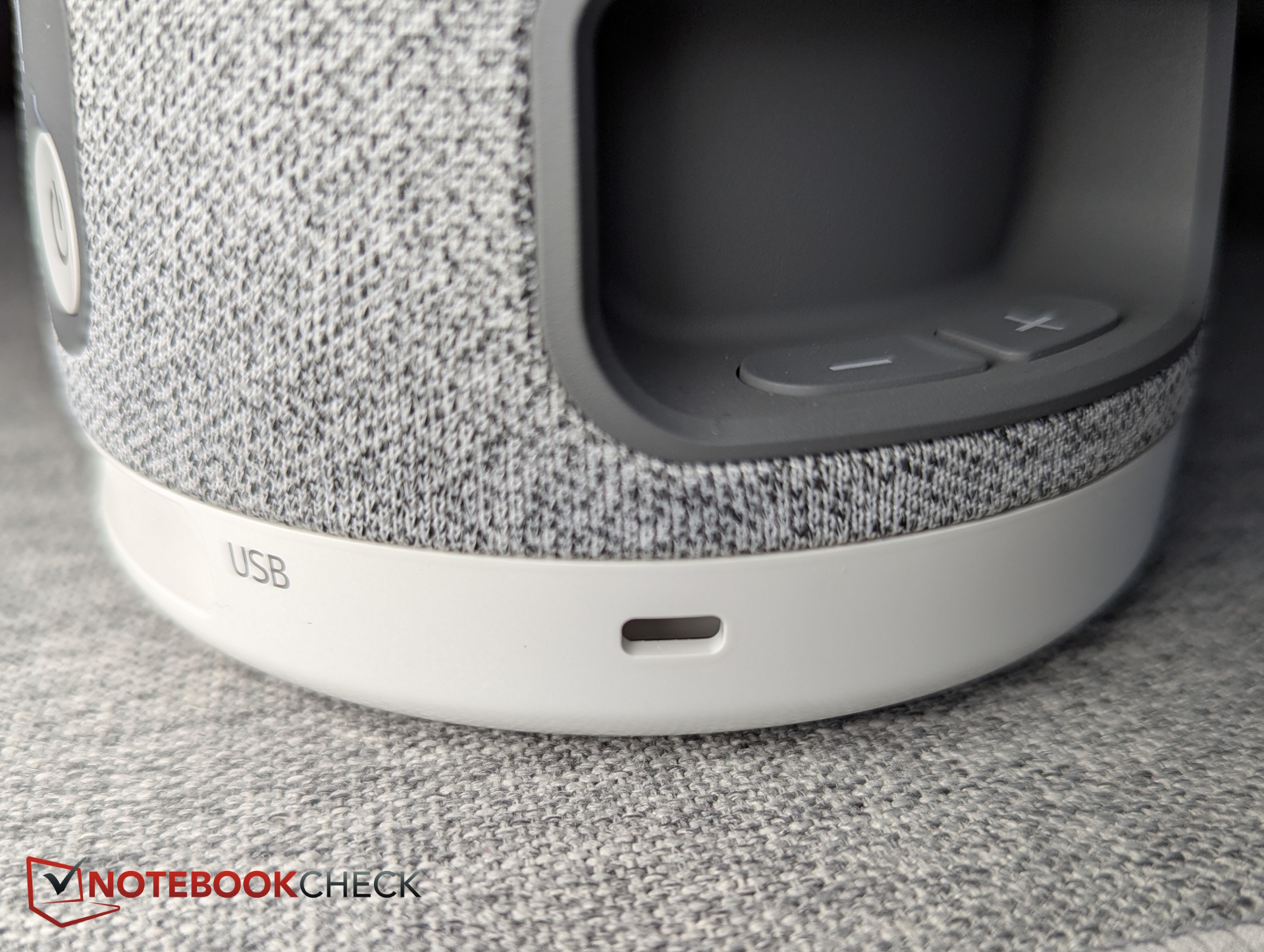 Im unteren Drittel sind die 3 Lautsprecher mit grauem Textil ummantelt. Zu beiden Seiten gibt es Lautstärketasten. Ganz unten befinden sich die Anschlüsse.