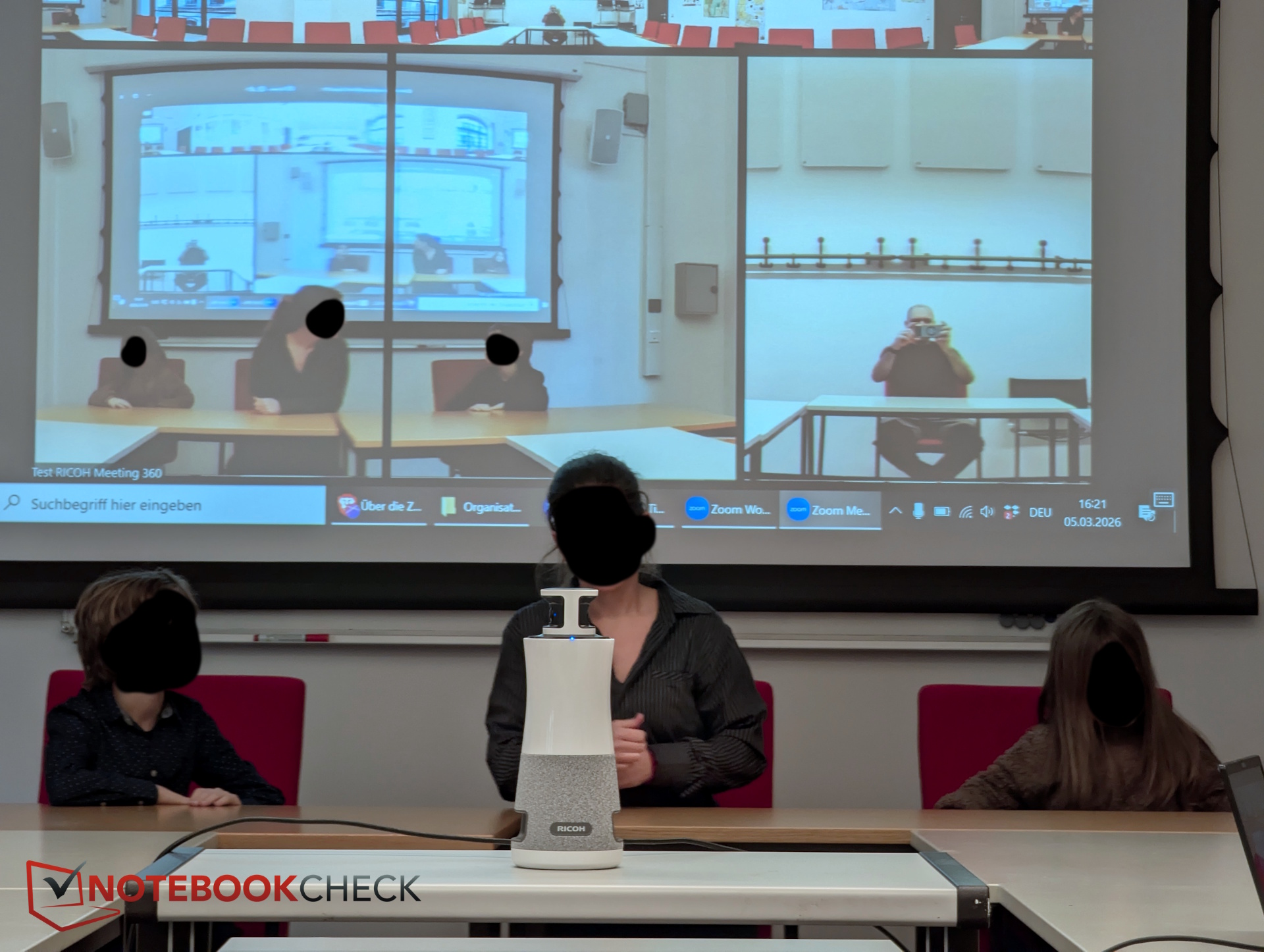 Die Zooms sind nur digital, sitzt man also im gezeigten Raum ganz am Ende, so ist das Bild nur noch recht klein und etwas unscharf. Das System eignet sich vor allem für kleinere Konferenzräume, wo alle möglichst am gleichen Tisch sitzen. In einem Seminarszenario kann es mit weiter entfernten Teilnehmern schwieriger werden. Ricoh gibt die Videoreichweite mit 3,6 m an.