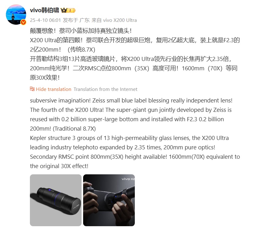 Wenn wir das richtig interpretieren, wird aus dem 1/1.4 Zoll großen 200 Megapixel Telefoto mit optischer 85mm Brennweite und F/2.27 Blende eine deutlich weitreichendere Zoomkamera, die um das 2,35-fache vergrößert. Damit soll 8,7-facher optischer oder bis zu 70x digitaler Zoom beziehungsweise eine äquivalente Brennweite von 1.600mm mit der Qualität des Vivo X200 Ultra bei 30x-Zooms ohne die Zusatzoptik ermöglicht werden, sofern man bereit ist, Photography Kit und die auf dem Photo nicht gerade klein aussehende Zeiss-Optik mit 3 Linsengruppen von jeweils 13 hochdurchlässigen Zeiss-Gläsern mit sich rumzuführen.
