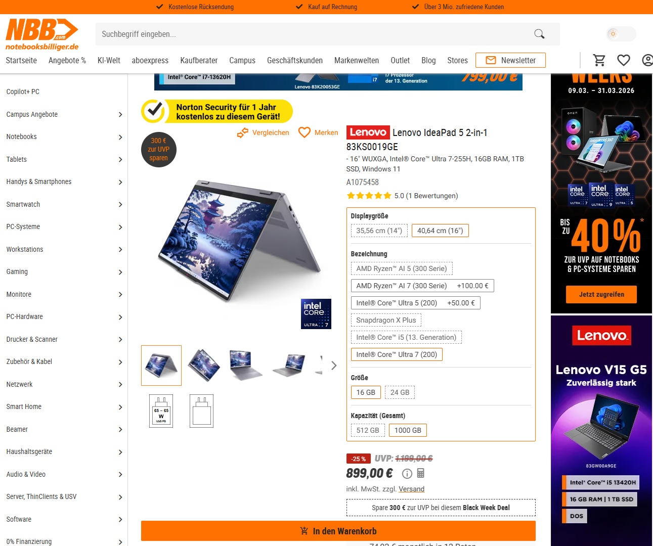 Lenovo hält mit der IdeaPad-5-2-in-1-16-Reihe eine Serie von Convertibles im 16-Zoll-Format bereit. Diese Gerätegattung ist durch um 360 Grad umklappbare Bildschirme gekennzeichnet, welche eine Nutzung der Geräte als herkömmliche Laptops oder Tablets ermöglichen. Aktuell führt Notebooksbilliger.de mit dem IdeaPad 5 2-in-1 16IAL10 83KS0019GE einen Vertreter der Reihe zu einem Preis von 899 Euro im Sortiment. Ein Schwestermodell ergatterte in unserem Test die Note „Gut (79 %)“.