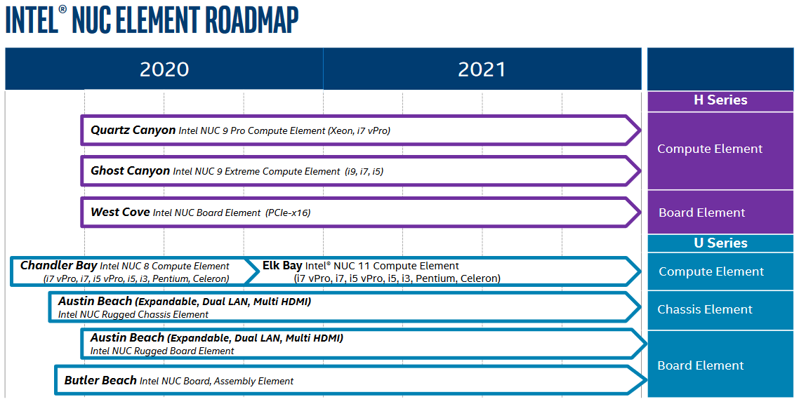 Darüber hinaus gibt's im Roadmap noch ein paar weitere Informationen. So soll der aktuelle Frost Canyon mit Intel Comet Lake-U-Prozessoren noch bis Ende 2021 angeboten werden, genau wie Provo Canyon, Quartz Canyon, June Canyon, Chaco Canyon und Ghost Canyon. Neu eingeführt wird dagegen ein Elk Bay Compute Element, das mit einer Vielzahl von Chips verfügbar sein wird, vom Intel Celeron bis hin zum Core i7.