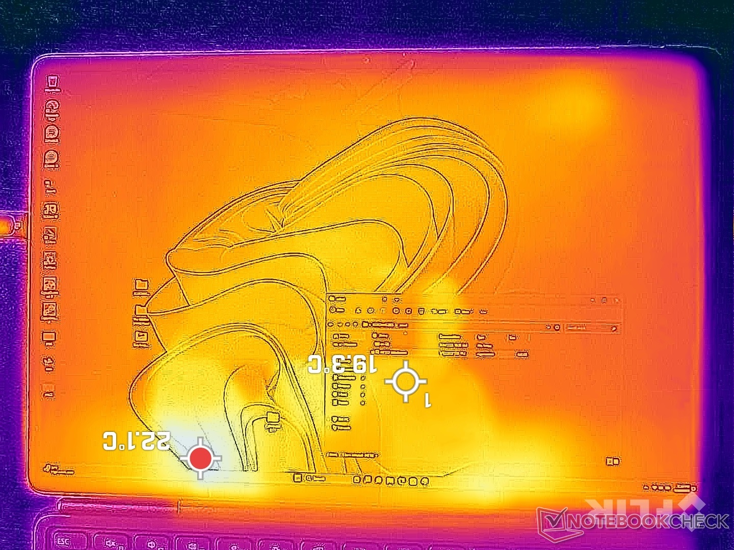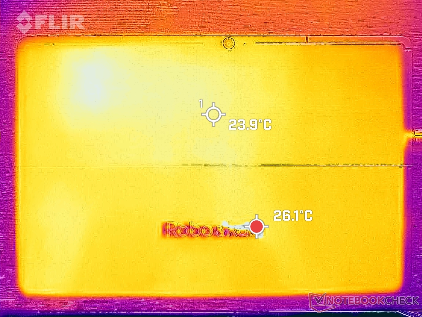 Die Oberfläche des TW220 kann merkbar warm werden, auch wenn nicht so warm wie beim Surface Pro 9. Die heißesten Stellen erreichen dabei zwischen 36 und 40 °C, im Vergleich zu den 45 °C beim Microsoft Tablet.