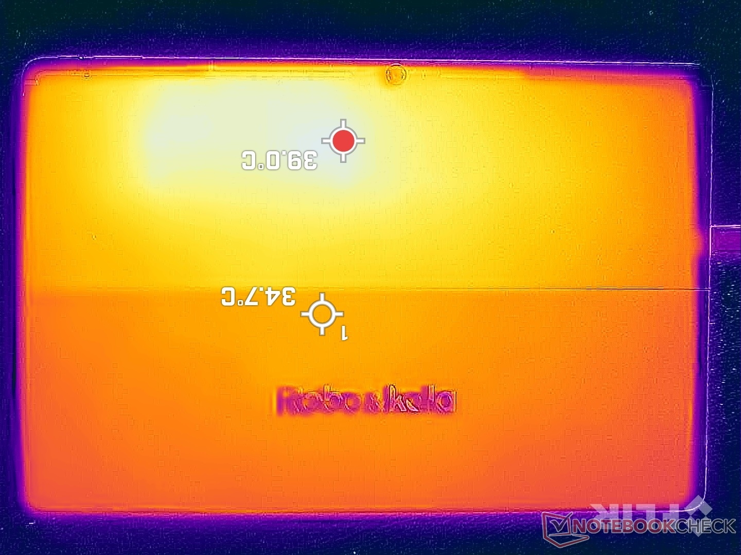 (+) Die maximale Temperatur auf der Oberseite ist 39.4 °C. Im Vergleich liegt der Klassendurchschnitt bei 33.7 °C (von 20.7 bis 53.2 °C für die Klasse Tablet).