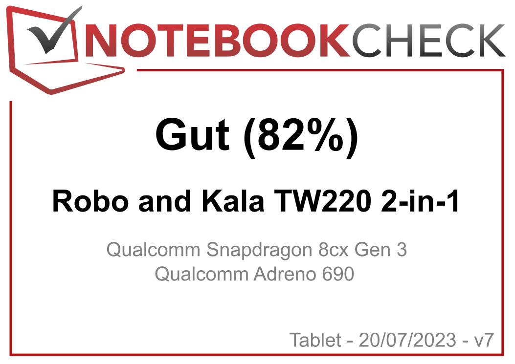 | 82.1 % v7 (old) | 07 / 2023 | Robo and Kala TW220 2-in-1 SD 8cx Gen 3, Adreno 690 | 712 g | 7.3 mm | 12.60" | 2560x1600 | |