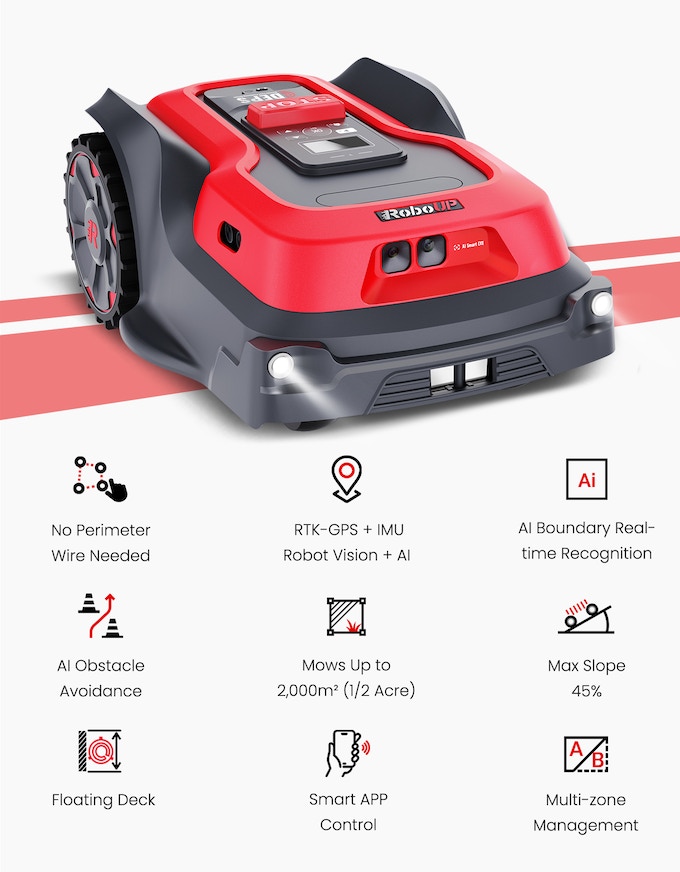 Ebenfalls an Bord sind eine KI-Hinderniserkennung über Kameras und Sensoren, die Menschen, Tiere, Bäume, Spielzeug und mehr erkennt, sowie ein Flutlicht an der Front. Ausgelegt ist der RoboUp, der in den Varianten T1000P und T2000P erhältlich ist, für Flächen von bis zu 2.000 Quadratmetern. Steigungen meistert er bis zu 45 Prozent, beherrscht zudem mehrere Zonen und kann natürlich auch via App gesteuert werden.