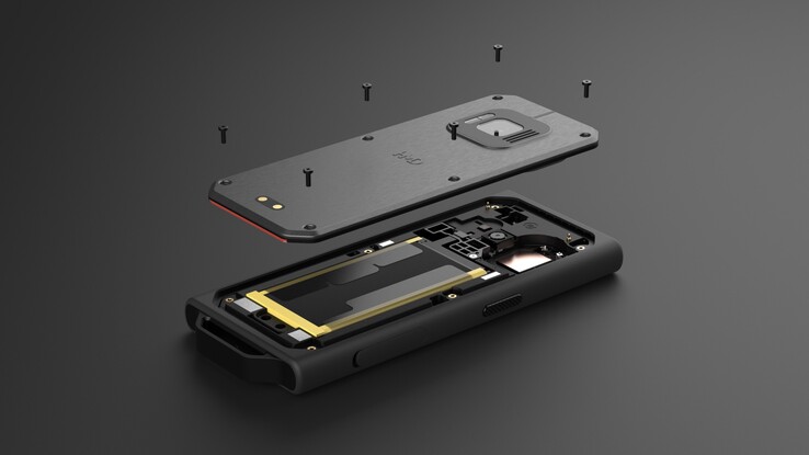 Der 2.510 mAh Akku soll eine Standby-Laufzeit von bis zu zehn Tagen ermöglichen. Eine volle Ladung über USB-C dauert drei Stunden. Alternativ stehen zum Aufladen auch Pogo-Pins auf der Rückseite zur Verfügung, wodurch das Handy einfach in die separat erhältliche Ladestation gesteckt werden kann. Links und rechts am Gehäuse findet sich jeweils ein programmierbarer Button. Standardmäßig wird ein Button für Notrufe und einer für eine Push-to-Talk-Funktion verwendet, wodurch das HMD Terra M wie ein Funkgerät benutzt werden kann.