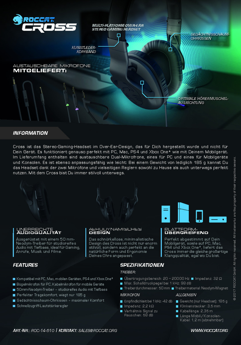 Neben 50-mm-Neodymium-Treiber verfügt der Roccat Cross über ergonomisch abgestimmte Ohrmuscheln mit Memory-foam Ohrpolstern und einem strapazierfähigen Kunstleder-Kopfband. Mit dem Cross will Roccat vor allem Spieler ansprechen, die keine separaten Headsets für PC, Konsole und Smartphone wollen, sondern eine All-in-one-Lösung bevorzugen.