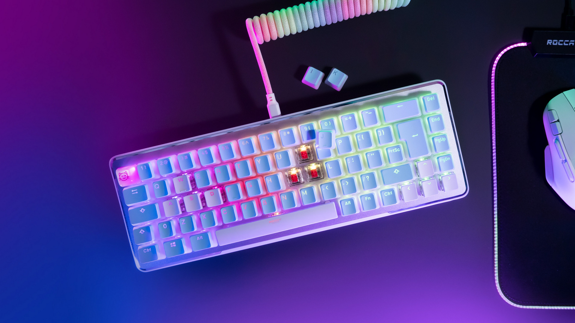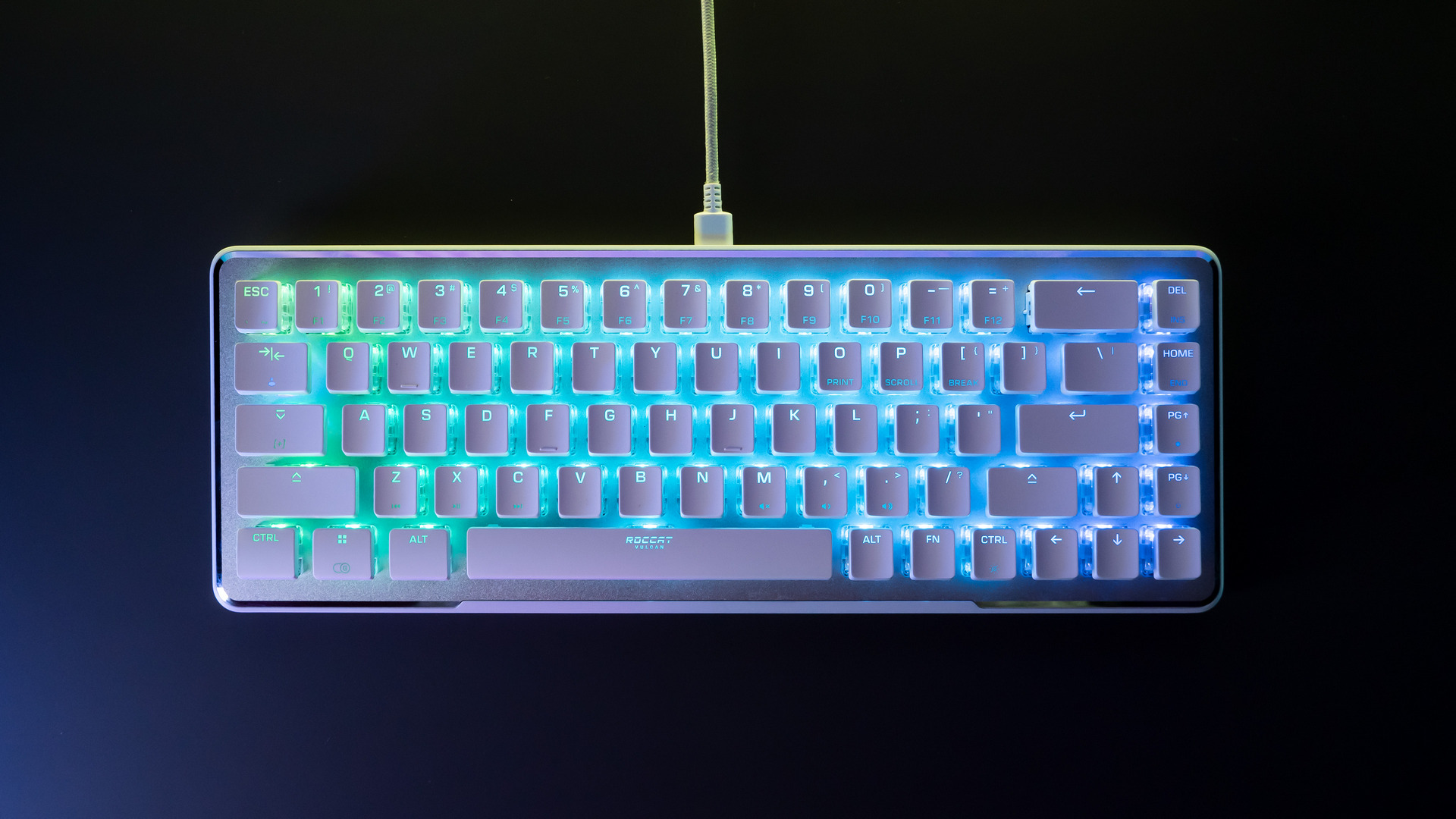 Auf der Vulcan II Mini lassen sich bis zu 5 Profile mit benutzerdefinierter RGB-Beleuchtung und Tastenbelegung speichern. Abgerundet wir die Ausstattung der Roccat Vulcan II Mini durch die Aimo-RGB-Beleuchtung. ROCCATs Vulcan II Mini ist in Ash Black oder Arctic White erhältlich, und PC-Spielende können ihre eigene persönliche Note mit kreuzförmigen Mount-Tastenkappen von Drittanbietern oder bunten USB-C-Kabeln (separat erhältlich) hinzufügen.