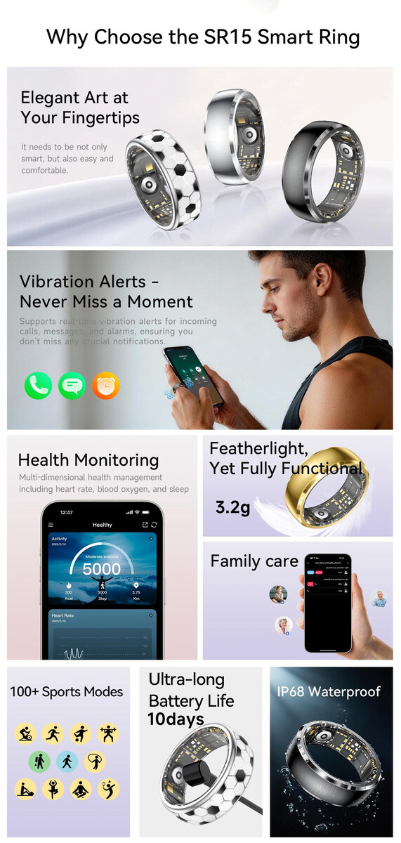 Der SR15 bietet mehrere interaktive Funktionen. Ein integrierter Vibrationsmotor liefert haptische Hinweise bei eingehenden Anrufen, Nachrichten und Alarmen direkt am Finger. Darüber hinaus lassen sich Gestensteuerungen wie doppeltes Tippen nutzen, um Musik, E-Books oder Kurzvideos auf einem gekoppelten Smartphone zu steuern. Unterstützt werden Android 9.0 und iOS 10.0 oder neuere Versionen.