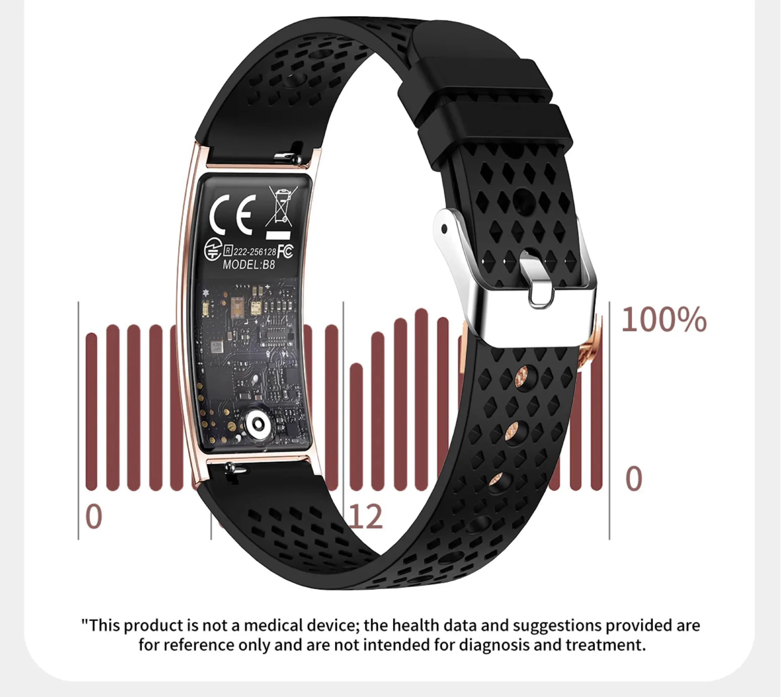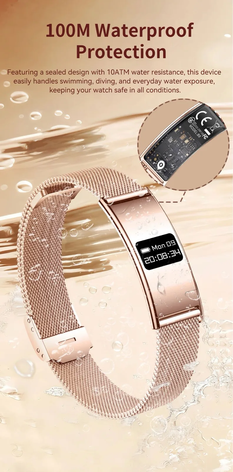 Das Wearable ist bis 10 ATM wasserfest, und kann somit auch beim Schwimmen getragen werden. Trotz besonders schlankem Gehäuse soll bei normaler Nutzung eine Akkulaufzeit von acht bis zehn Tagen erreicht werden, unter anderem durch den sparsamen OM6626B-Prozessor. Ein kleines Display zeigt nicht nur Details zur verbleibenden Akkuladung sowie zu Uhrzeit und Datum an, sondern kann auch auf eingehende Nachrichten und Anrufe beim gekoppelten Smartphone hinweisen.