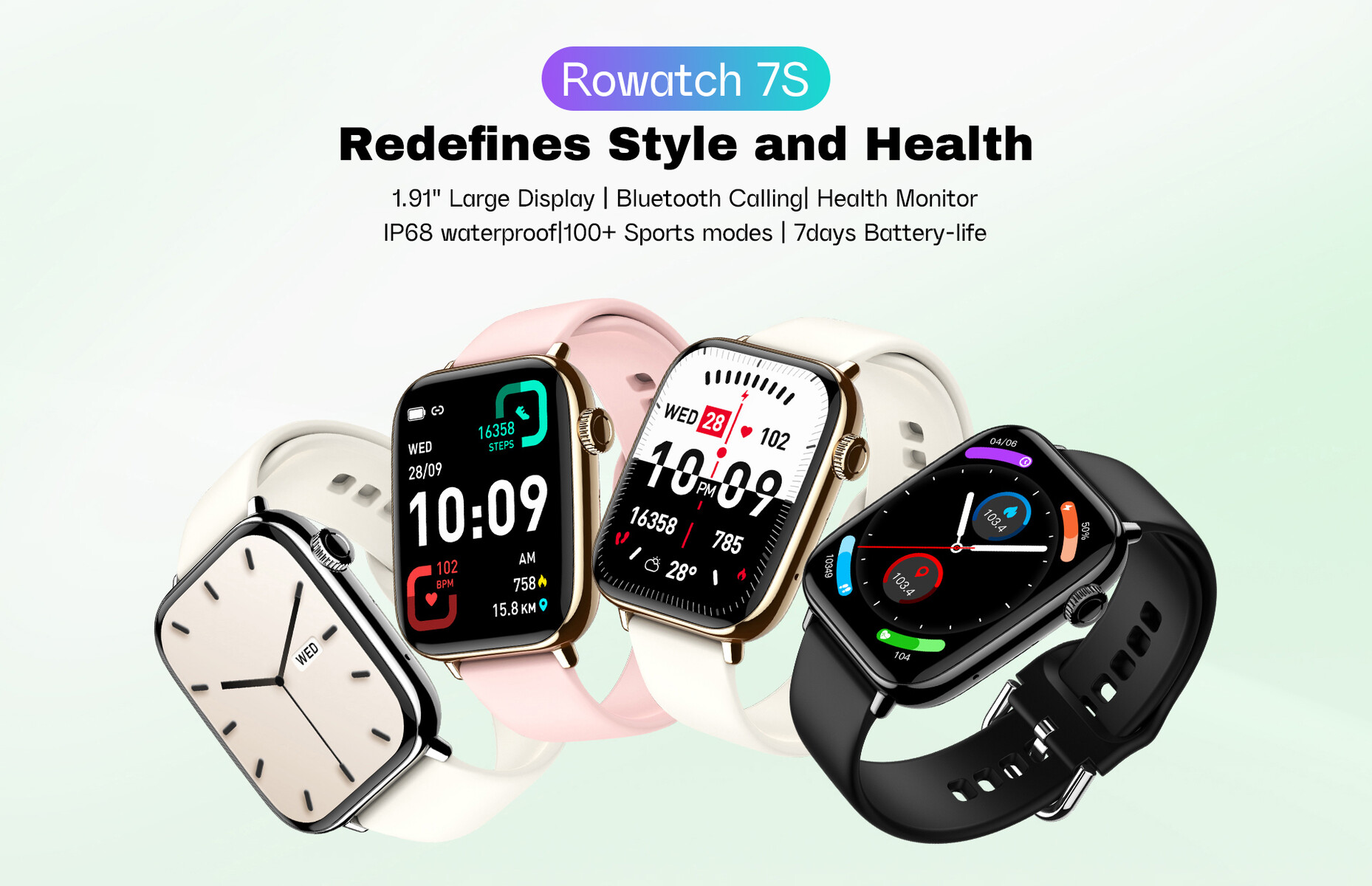 Ausgestattet ist die Smartwatch mit einem 1,91 Zoll großem Bildschirm mit einer Auflösung von 280 x 326 Pixeln, dementsprechend ist das Modell rechteckig und nicht quadratisch. Die maximale Helligkeit wird mit 450 cd/m² angegeben. Verbaut sind Lautsprecher und Mikrofon, damit unterstützt die Uhr Telefonfunktionen - in Ermangelung eines eigenen Mobilfunkmodems agiert die Rowatch 7S dann als Bluetooth-Freisprecheinrichtung.