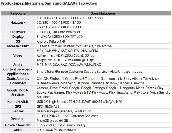 Ruggedized: Mit dem neuen Tablet Galaxy Tab Active inklusive Android 4.4 KitKat als Mobile OS präsentiert Samsungs der Konkurrenz von Panasonic (Toughpad) und Co. seine Antwort auf die Bedürfnisse von Business-Kunden nach einem soliden und zuverlässigen Tablet-PC, der außerhalb des Office ordentlich was wegstecken kann. Samsung adressiert mit seinem robusten Galaxy Tab Active beispielsweise die Bereiche Handel, Logistik oder Transport.