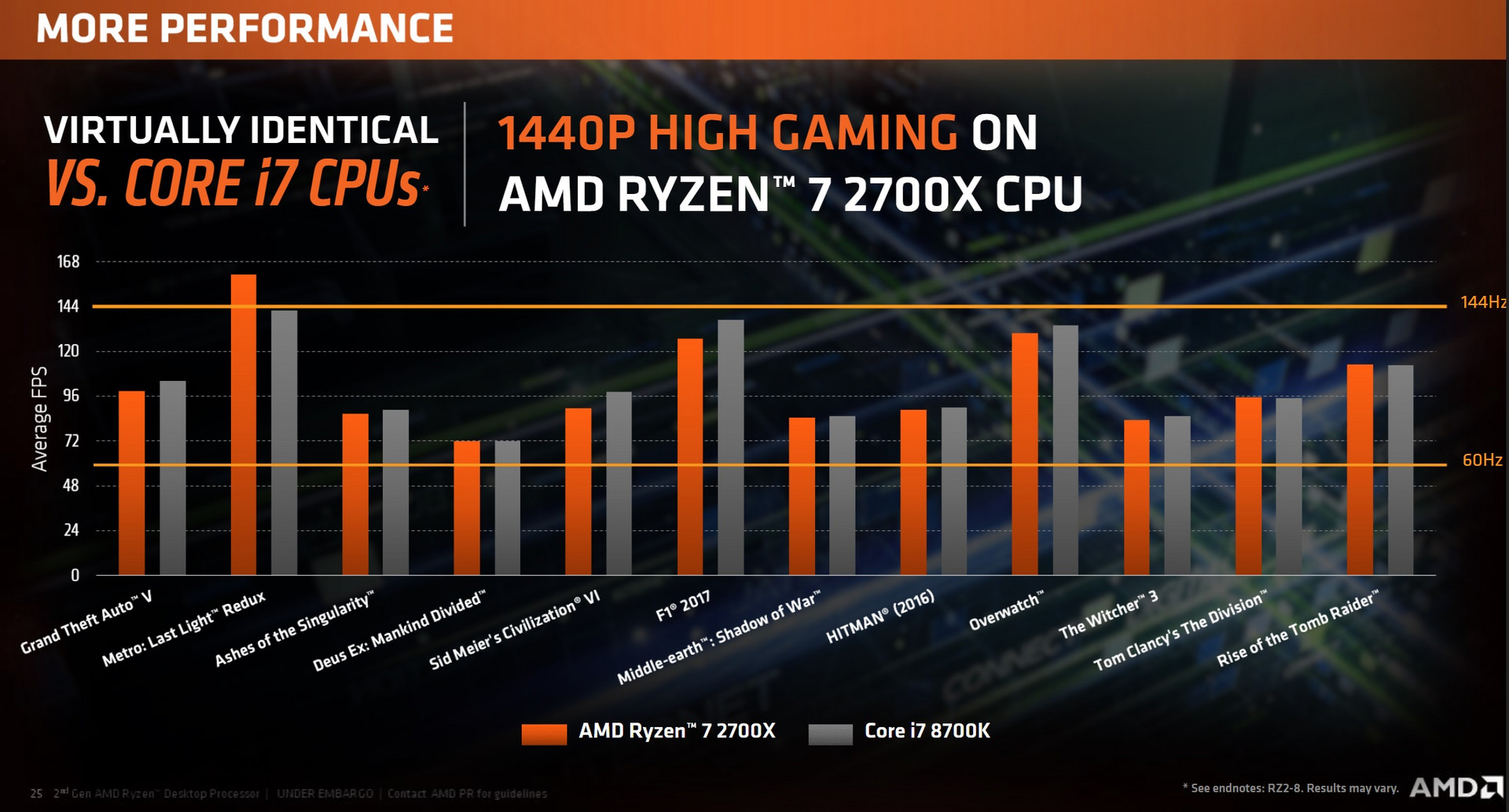 In Sachen Spieleleistung profitieren die neuen Ryzen deutlich von den Verbesserungen in der Architektur. Die Erhöhung der Taktfrequenzen kommt vor allem den Spielen zugute, die nicht auf Multi-Threading optimiert sind. Aber auch hier kann die neue Prozessorgeneration punkten, denn der bessere Boost-Takt sorgt unter Last für eine stabile Taktfrequenz von bis zu 4 GHz beim Ryzen 7 2700X.