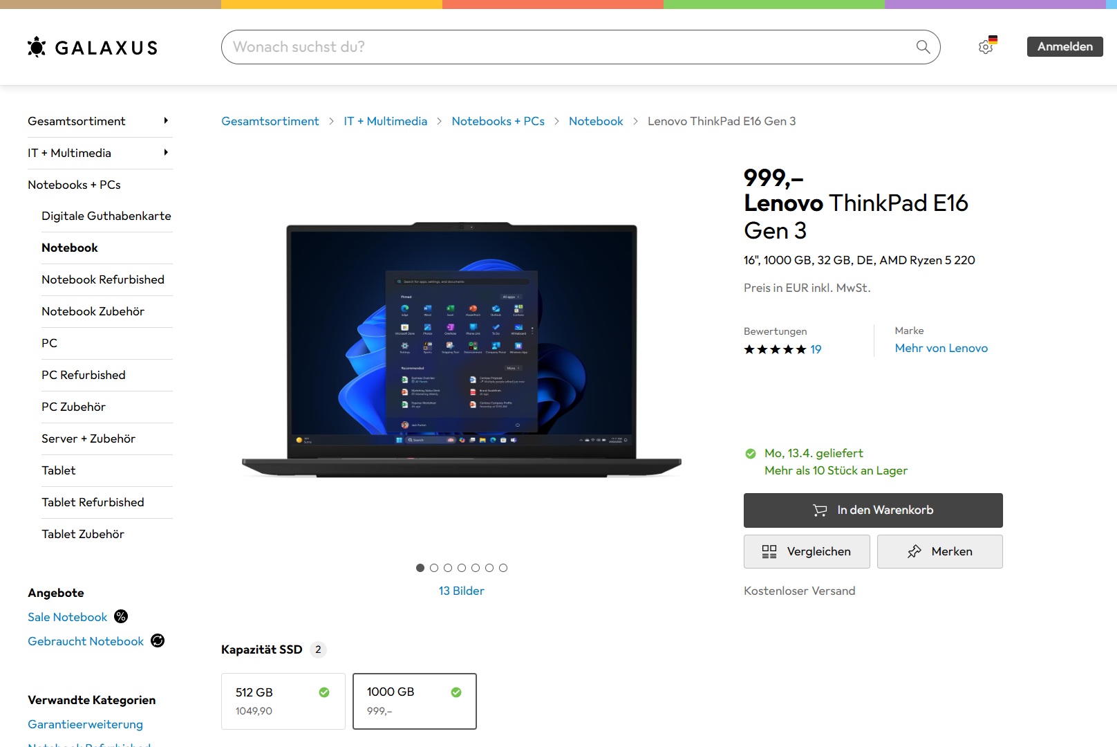 Lenovos preisgünstige ThinkPad-E-Reihe liegt mittlerweile in dritter Generation bei den Händlern. Aktuell führen Galaxus.de und Amazon.de mit dem ThinkPad E16 G3 21ST004GGE ein AMD-basiertes 16-Zoll-Modell der Reihe zu einem Preis von 999 Euro in ihren Sortimenten - Amazon nennt einen Lieferzeitraum von mehreren Monaten. Ein äußerlich baugleiches, Intel-basiertes Schwestermodell erreichte die Note „Gut (87 %)“ in unserem Test.