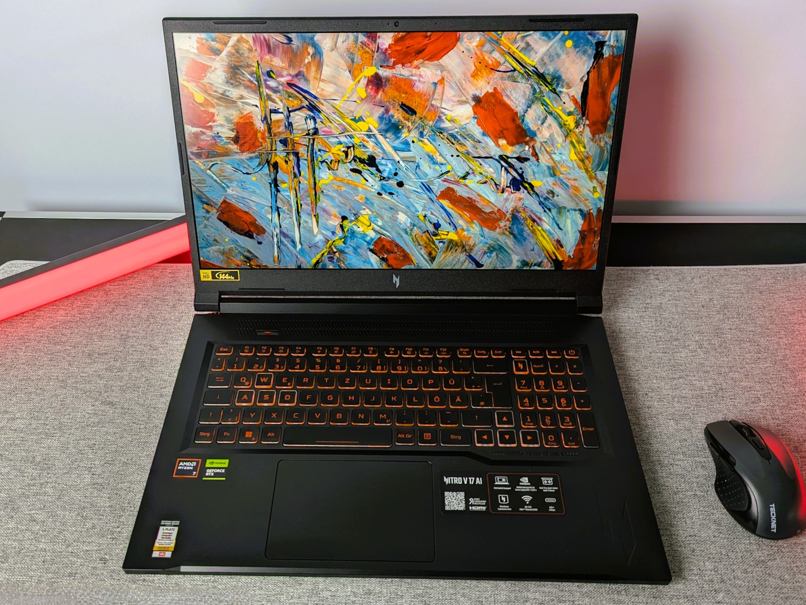 Das Nitro bringt einen matten 17.3-Zoll-Bildschirm im 16:9-Format mit, der über eine native Auflösung von 1.920 x 1.080 Bildpunkten sowie eine hohe Bildwiederholfrequenz von 144 Hz verfügt. Das blickwinkelstabile IPS-Panel liefert laut unseres Tests eine recht niedrige Helligkeit, der Kontrast geht in Ordnung. Die Farbraumabdeckung fällt mau aus. Windows 11 Home dient als Betriebssystem.