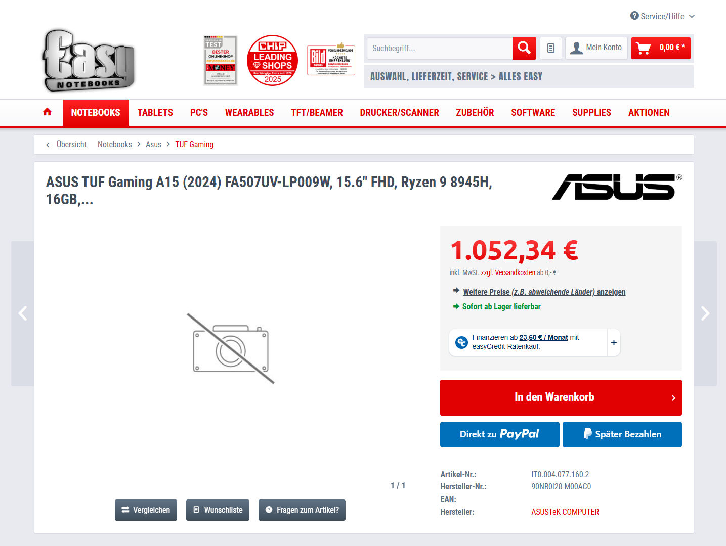 Preiswerte Gaming-Notebooks hält Asus innerhalb der TUF-Gaming-Reihe bereit. Aktuell führt Easynotebooks.de mit dem TUF Gaming A15 FA507UV-LP009W ein gut ausgestattetes 15,6-Zoll-Modell der Reihe zu einem Preis von 1.052,34 Euro im Sortiment. Händler wie Computeruniverse.net und Cyberport.de verlangen 1.075 Euro für den Rechner. Ein nahezu identisch bestücktes Schwestermodell ergatterte in unserem Test die Bewertung „Gut (80 %)“.