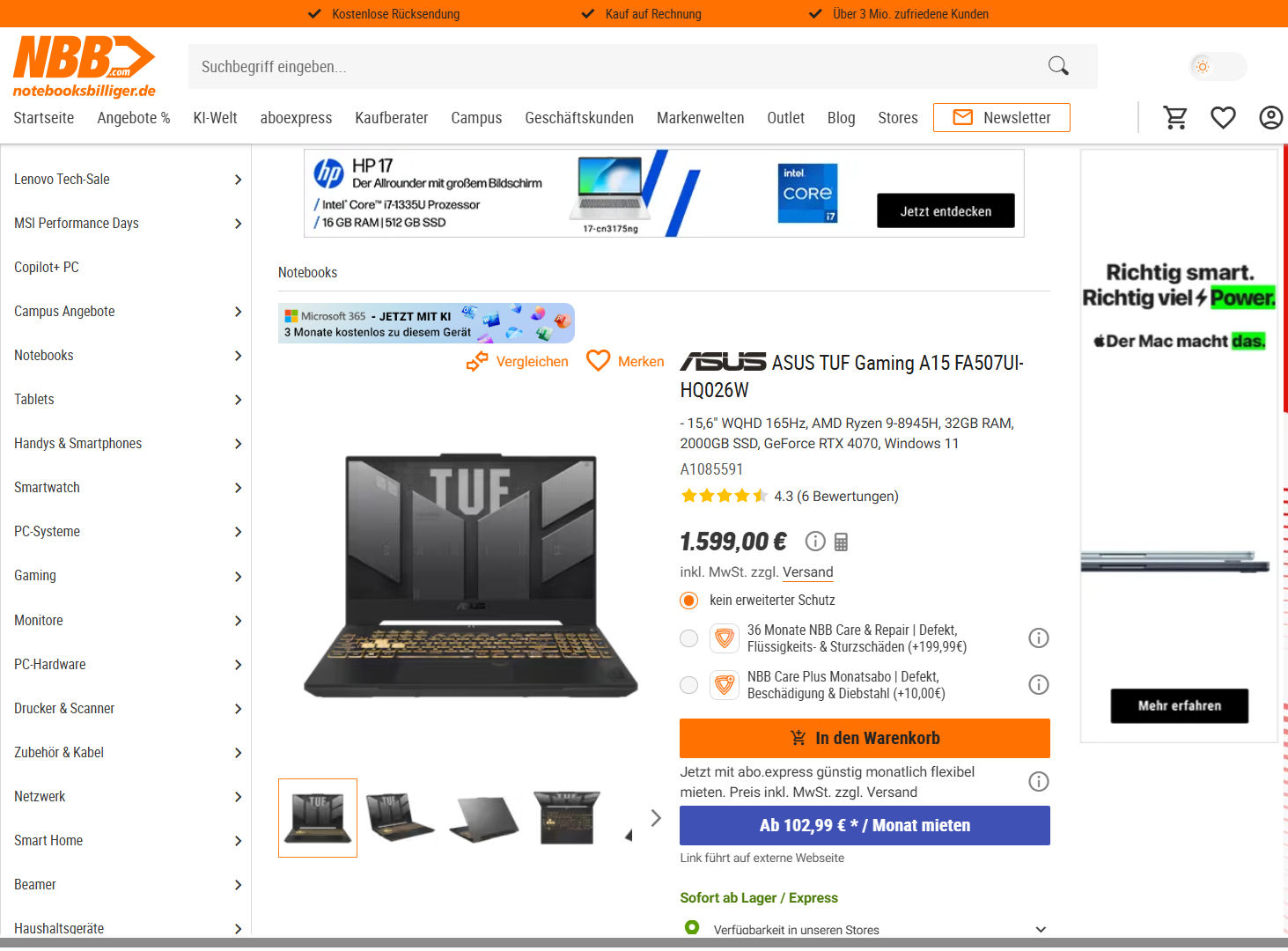 Die TUF-Gaming-Reihe der Firma Asus steht für Gaming-Notebooks aus dem unteren bis mittleren Preissegment. Aktuell führt Notebooksbilliger.de mit dem TUF Gaming A15 FA507UI-HQ026W ein hervorragend ausgestattetes Top-Modell der Reihe zu einem Angebotspreis von 1.599 Euro im Sortiment. Ein schlechter bestücktes Schwestermodell erreichte in unserem Test die Bewertung „Gut (80 %)“.