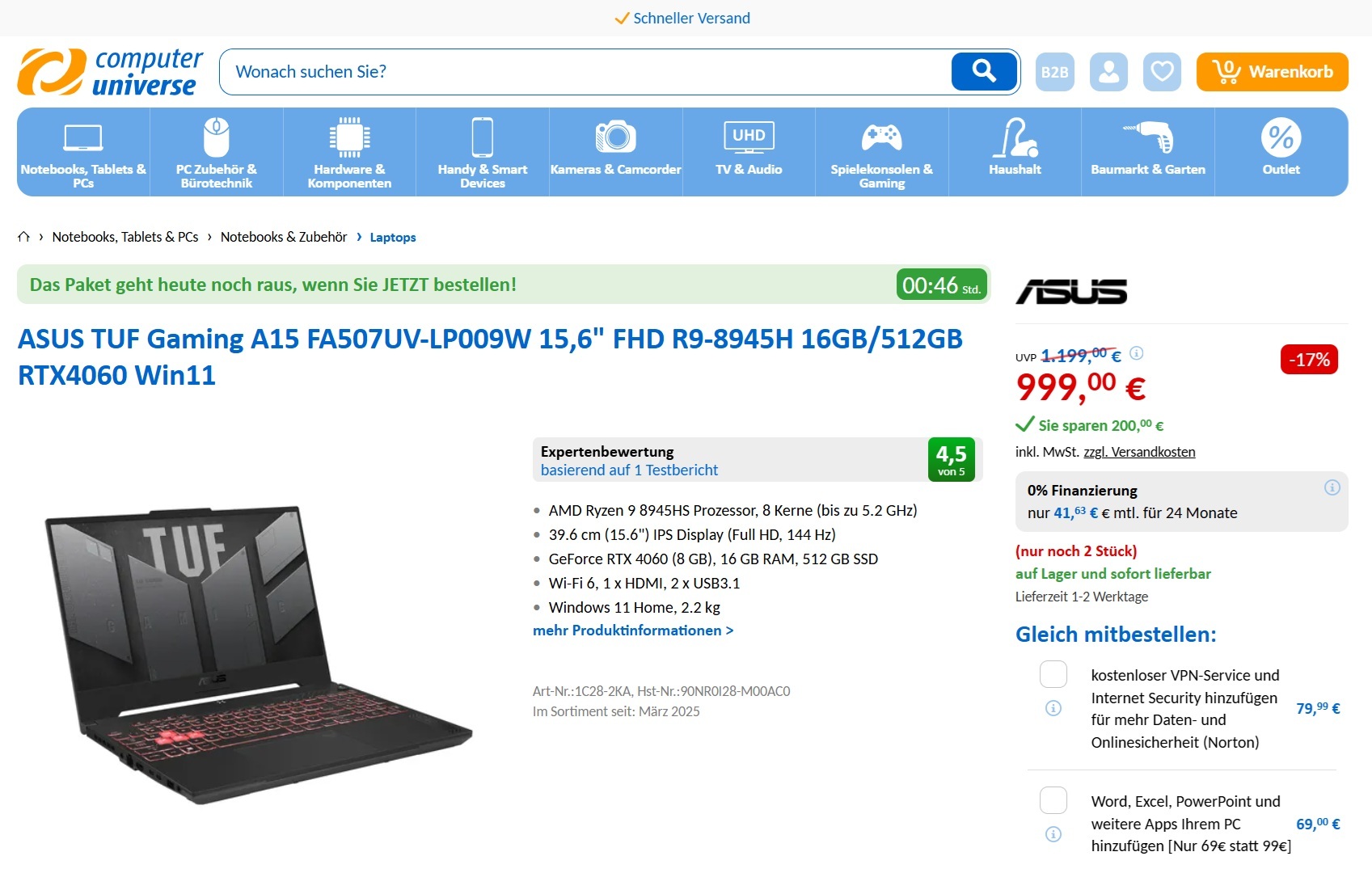 Asus hält mit dem TUF Gaming A15 FA507UV-LP009W ein Gaming-Notebook der Mittelklasse bereit, das mit einer recht potenten CPU bestückt ist. Aktuell führt Computeruniverse.net den Rechner zu einem Angebotspreis von 999 Euro im Sortiment - es sind allerdings nur noch sehr wenige Exemplare verfügbar. Alternative Angebote (z.B. Cyberport.de) liegen um 85 Euro höher. Ein Schwestermodell erreichte in unserem Test die Bewertung „Gut (80 %)“.