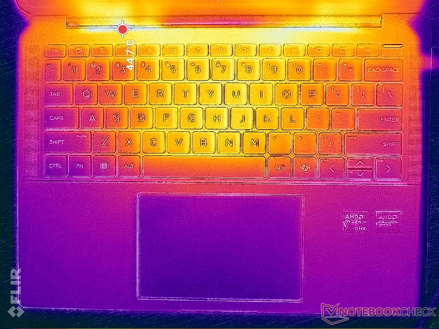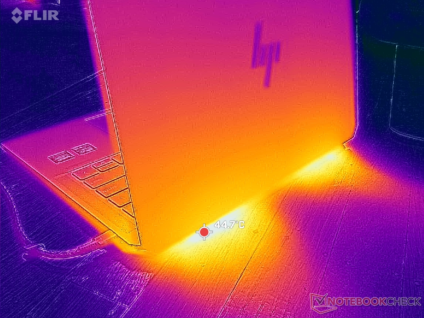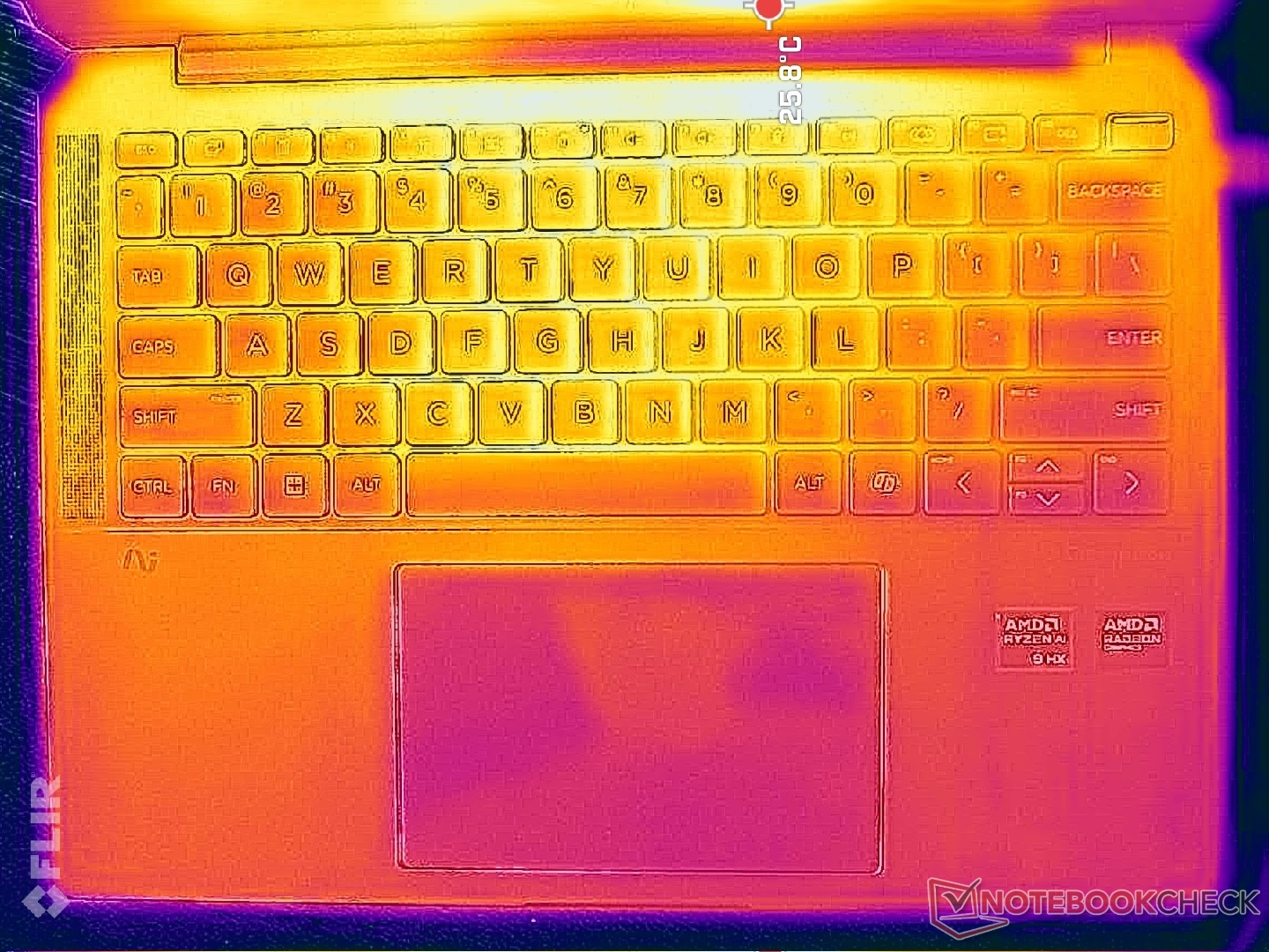 Die Oberflächentemperaturentwicklung ist symmetrisch, um die symmetrische Kühllösung im Inneren widerzuspiegeln. Hotspots in der Mitte der Tastatur erreichen knapp über 41 °C, wenn Spiele oder andere anspruchsvolle Aufgaben ausgeführt werden. Damit ist es im Durchschnitt kühler als das Spectre x360 14 unter ähnlichen Bedingungen. Das konkurrierende Yoga Pro 7 14 G9, das ebenfalls auf einer ähnlichen Zen-5-Plattform läuft, erreicht ähnliche maximale Oberflächentemperaturen wie unser OmniBook, allerdings mit größeren Hotspots.