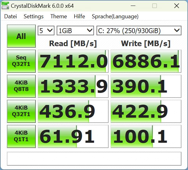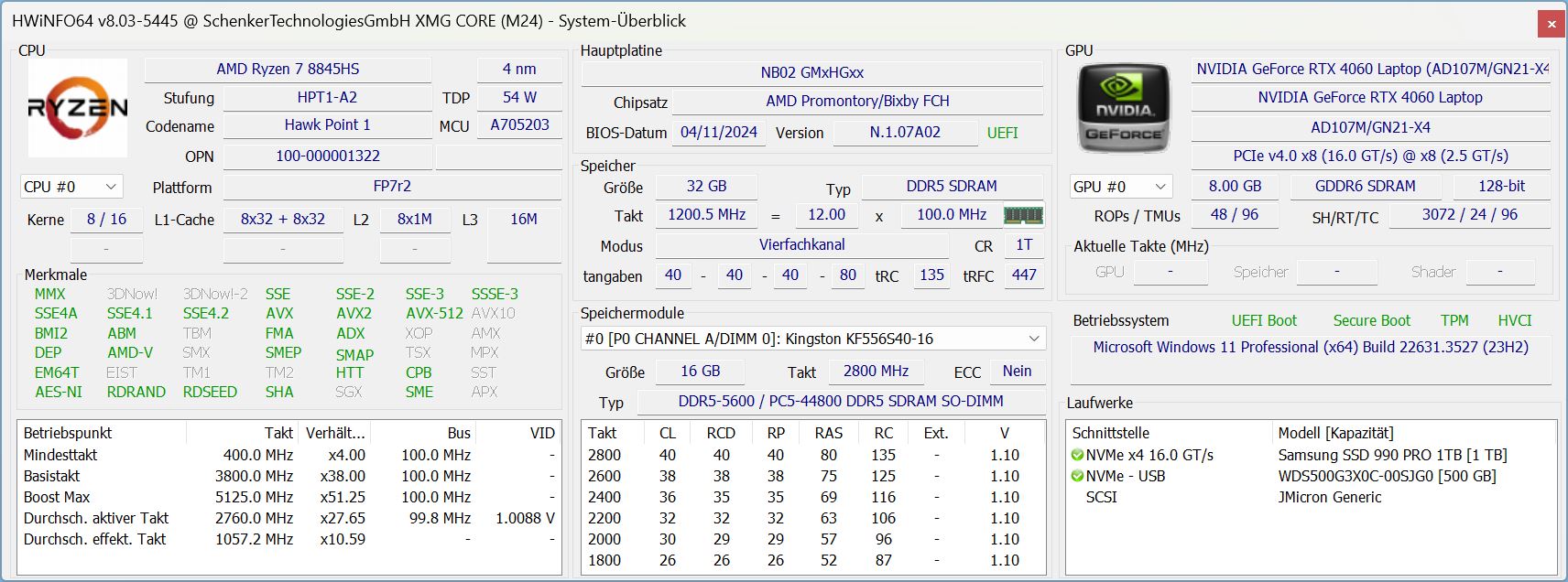 | Schenker XMG Core 15 (M24) R7 8845HS, GeForce RTX 4060 Laptop GPU, Samsung 990 Pro 1 TB, IPS, 2560x1600, 15.3" | Lenovo Legion 5 16IRX G9 i7-14650HX, GeForce RTX 4060 Laptop GPU, Samsung PM9A1 MZVL21T0HCLR, IPS, 2560x1600, 16" | HP Victus 16 (2024) i7-14700HX, GeForce RTX 4060 Laptop GPU, Kioxia XG8 KXG80ZNV512G, IPS, 1920x1080, 16.1" | Dell G16, i7-13650HX, RTX 4060 i7-13650HX, GeForce RTX 4060 Laptop GPU, WD PC SN740 SDDPNQD-1T00, IPS, 2560x1600, 16" | Schenker XMG Fusion 15 (Early 24) i9-14900HX, GeForce RTX 4070 Laptop GPU, Samsung 990 Pro 1 TB, IPS, 2560x1600, 15.3" | Schenker XMG Pro 15 (E23) i9-13900HX, GeForce RTX 4060 Laptop GPU, Crucial P5 Plus 1TB CT1000P5PSSD8, IPS, 2560x1440, 15.6" | Durchschnittliche NVIDIA GeForce RTX 4060 Laptop GPU | Durchschnitt der Klasse Gaming | |