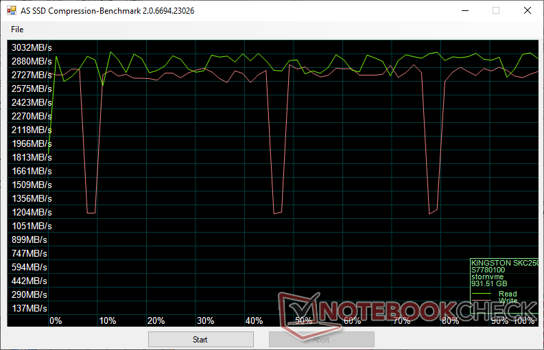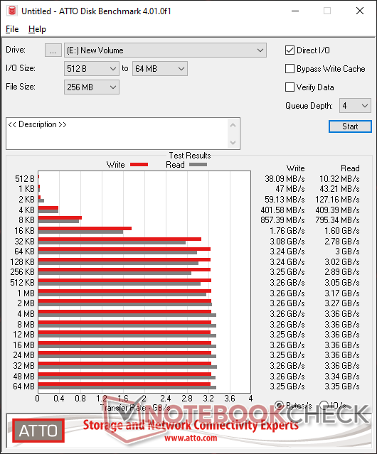 ATTO testet Übertragungsraten über einen großen Bereich von Blockgrößen, um ein größeres Gesamtbild der Antriebsleistung zu zeichnen. Die Ergebnisse zeigen Lese- und Schreibgeschwindigkeiten, die bei Blöcken von 32 KB oder mehr erreicht werden, was früher ist als das, was wir auf dem Lexar NM610 oder dem Kingston KC2500 beobachtet haben. Der Nachteil ist jedoch die viel langsamere Leistung bei sehr kleinen Blockgrößen von weniger als 8 KB.