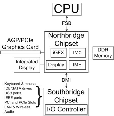 Speicher müssen an die CPU angebunden werden, wobei hier ein klassischer Aufbau mit North- und Southbridge angenommen werden soll – die konkrete Ausgestaltung der internen Verbindungen hängt auch stark von der tatsächlichen Plattform-Architektur ab. Die Verbindung zwischen CPU und den beiden Chipsätzen wird über dedizierte, interne und für den Anwender wenig relevante Datenleitungen wie etwa dem Direct Media Interface und QuickPath (Intel) bzw. HyperTransport (AMD) realisiert.