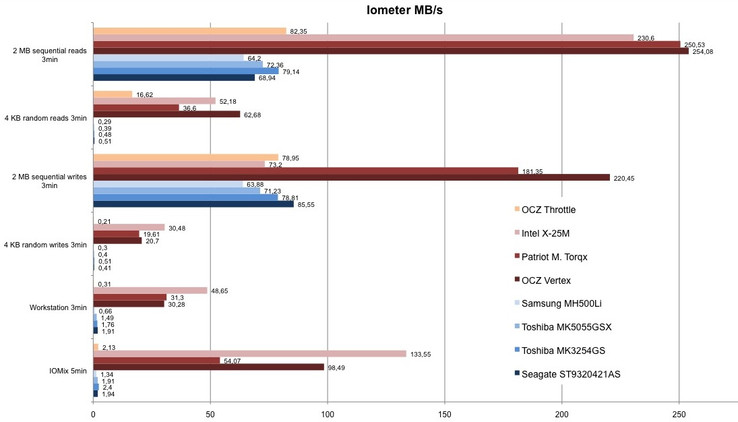 Die SSD glänzt vor allem bei praxisrelevanten zufälligen 4K Lese- und Schreiboperationen und kann daher in den Anwendungsszenarien von IOMeter (IOMIX, Workstation) deutlich punkten. Die sequentiellen Leseraten sind ebenfalls ausgezeichnet, jedoch wurde die SSD anscheinend absichtlich auf max. 75 MB / Sekunde beim Schreiben begrenzt (um der teureren SLC basierenden X25-E wohl keine zu starke Konkurrenz zu machen).