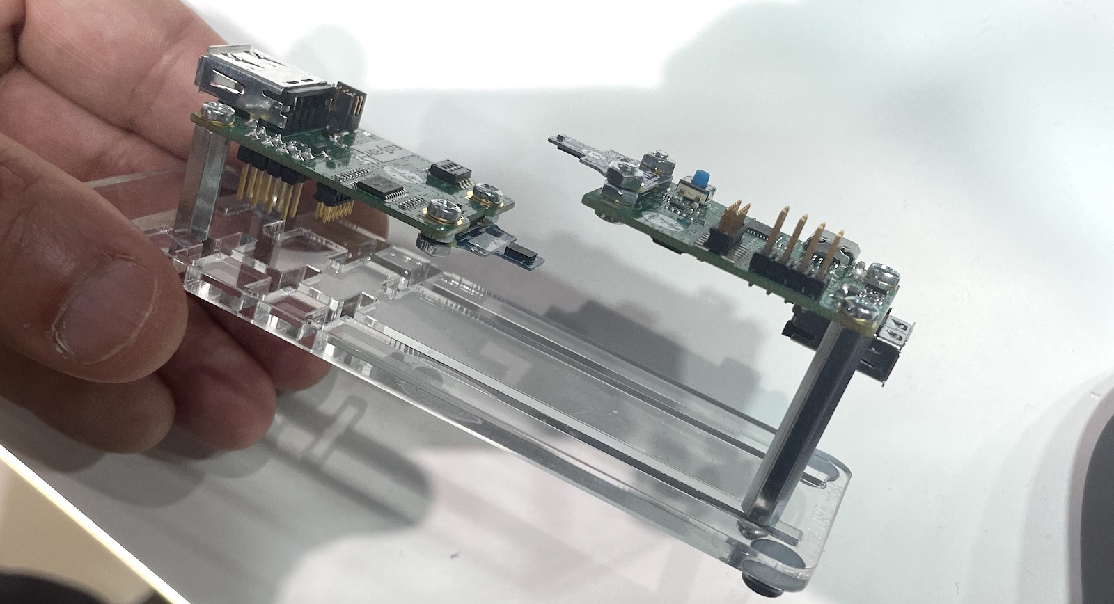 Auch die Energieübertragung ist kein Problem. ST60 kann mit einer drahtlosen Energieübertragung kombiniert werden. Die Verbindung selbst braucht übrigens gerade einmal 66 mW für eine Ethernetverbindung (5 GBit/s). USB 2.0 ist allerdings deutlich ineffizienter. 240 mW braucht es für 480 MBit/s. Die Angaben sind Leistungsaufnahmen von Empfänger- und Senderchip in Kombination, wobei der Empfang etwas weniger Energie braucht.