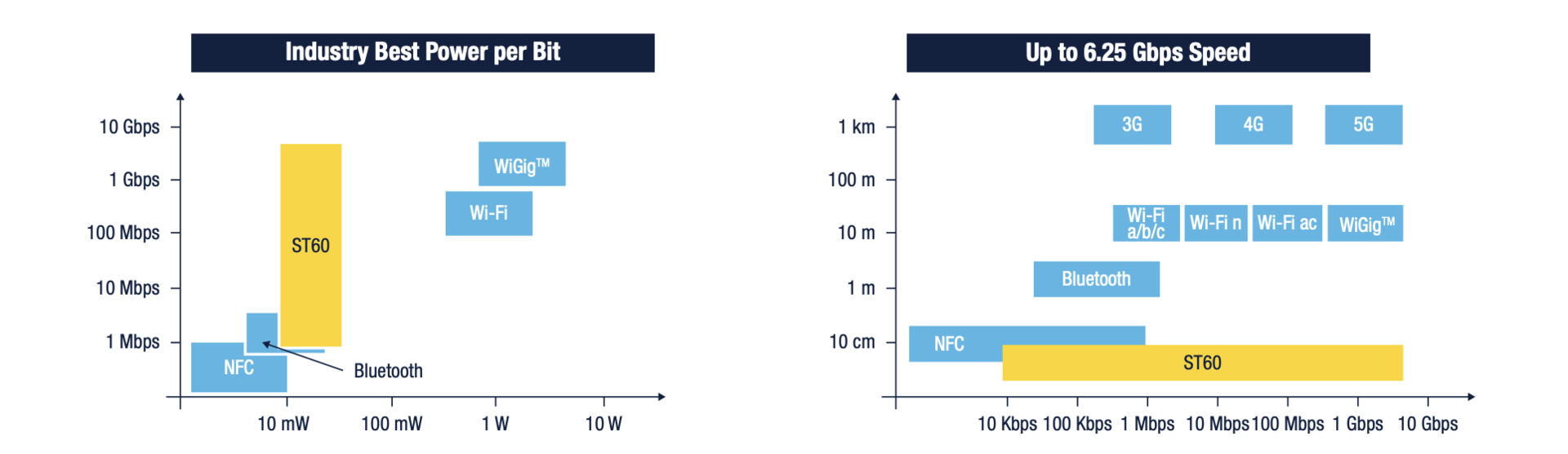In einer ST60-Verbindung im V-Band (60 GHz) können zwei verschiedene Übertragungsprotokolle untergebracht werden. Zum einen wäre das etwa Ethernet mit etwas über 6 GBit/s (ST60A2) und zum anderen USB 2.0 mit dem etwas jüngeren ST60A3. Wer jetzt in die Historie alter Drahtlostechniken schaut, der weiß, dass es dies eigentlich schon gibt. Wireless Ethernet gibt es in der Ausprägung WLAN und Wireless USB hat zwar keine Bedeutung mehr, aber existiert ebenfalls seit Langem.