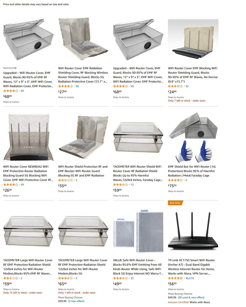 Aus Sicht eines Tech-Enthusiasten, dessen Ziel es gemeinhin ist, möglichst leistungsfähige Gerätschaften um sich zu versammeln, macht es natürlich absolut keinen Sinn, diese dann künstlich an ihrer Arbeit zu behindern aber die Zielgruppe für Router Shield-Guards, EMF Blocker oder ähnliche Produkte, die vor Strahlung schützen sollen, sind wohl ohnehin eine ganz andere. Umso mehr Spaß macht es, Linus beim Testen dieser bestenfalls nutzlosen, schlimmstenfalls kontraproduktiven Abzocke zuzusehen, die - wohl vor allem in den USA - zuhauf verkauft wird. Fündig wird man zwar noch nicht bei Amazon.de aber durchaus auf Amazon.com (der US-Version):