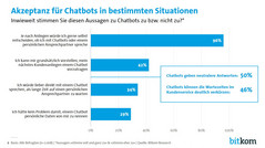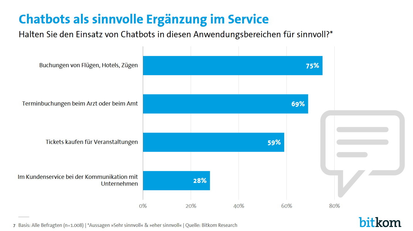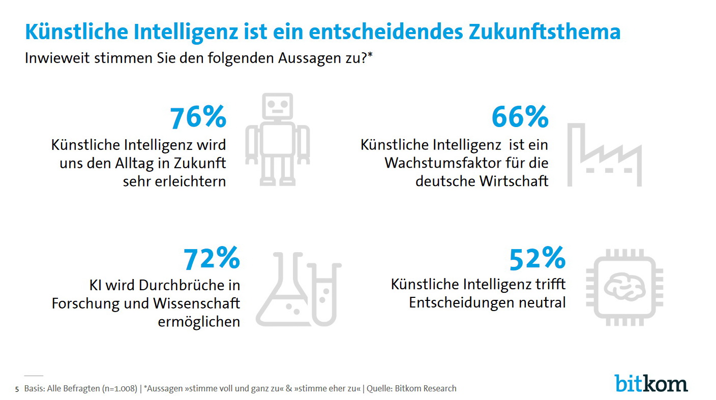 Laut einer aktuellen Umfrage zum Thema Künstliche Intelligenz haben 80 Prozent der Bundesbürger schon einmal von dem Begriff Künstliche Intelligenz gehört oder gelesen. Die Mehrheit von ihnen stehe der Technologie offen gegenüber. 55 Prozent der Bürger sehen eine Chance in Künstlicher Intelligenz, 41 Prozent eher eine Gefahr. Zudem können sich gut zwei Drittel (69 Prozent) vorstellen, bei bestimmten Entscheidungen auf KI-Empfehlungen zurückzugreifen. Außerdem sind drei von vier Bundesbürgern (76 Prozent) überzeugt, dass Künstliche Intelligenz den Alltag in Zukunft sehr erleichtern wird.