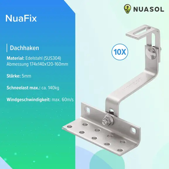 Wer noch Montagematerial für die Installation von Solarmodulen benötigt, könnte sich für die Dachhaken oder diverse Aufständerungen von Nuasol interessieren, die derzeit mit Rabatt erhältlich sind. Die Dachhaken für Solaranlagen sind sogar zum Bestpreis zu haben, bei den Aufständerungen gibt es zwar einen Nachlass von 10 Prozent, verglichen mit dem letzten Jahr sind manche Produkte aber preislich immer noch leicht gestiegen. Es lohnt sich also genauer hinzusehen.
