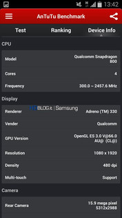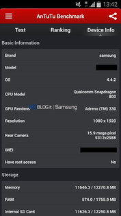 Ein neuer AnTuTu-Benchmark dokumentiert angeblich die Ausstattung und Leistung des Samsung Galaxy S5. Demnach verfügt Samsungs neues Vorzeige-Handy über einen Snapdragon-800-SoC mit den üblichen vier Kernen, der auf 2,5 GHz getaktet ist. Die zum SoC gehörige GPU Adreno 330 sorgt auf absehbare Zeit für flüssige Spiele. Zwei Gigabyte Arbeitsspeicher sind Flaggschiff-Standard, allerdings sind es auch auffallend weniger als die 3 GB RAM von Samsungs Galaxy Note 3. Insgesamt ist das Galaxy S5 laut Benchmarktests etwas schneller als das Note 3. Eine Kamera mit 16-Megapixel-Auflösung ist laut dem AnTuTu-Datenblatt an der Rückseite angebracht. Android 4.4.2 KitKat dient erwartungsgemäß als Betriebssystem.