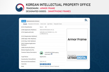 Sowohl bei der südkoreanischen KIPO als auch bei der US-Amerikanischen USPTO und dem europäischen Patentamt EUIPO hat sich Samsung das Warenzeichen "Armor Frame" schützen lassen wie die niederländischen Kollegen von LetsGoDigital entdeckt haben. Was Samsung konkret mit diesem potentiellen Marketing-Begriff ausdrücken will, ist noch nicht zweifelsfrei bewiesen, es liegt allerdings nahe, dass es sich hierbei um einen besonders widerstandsfähigen Rahmen für faltbare Displays handelt - wäre zumindest eine Theorie.