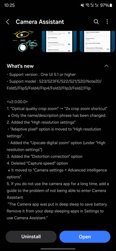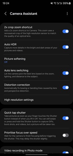 Im Hauptmenü findet man jetzt die Option "Distortion Correction", die im eingeschalteten Zustand die durch Optik oder Perspektive verzerrten Linien geradebiegen soll und das automatisch. Im Submenü "High Resolution Settings" findet man etwa am Galaxy S23 Ultra nun die Funktion "Upscale Digital Zoom", die durch digitalen Zoom in der Auflösung reduzierte Photos wieder hochskalieren soll. Ob das eher zugunsten oder zulasten der Photo-Qualität geht, muss man wohl ausprobieren.