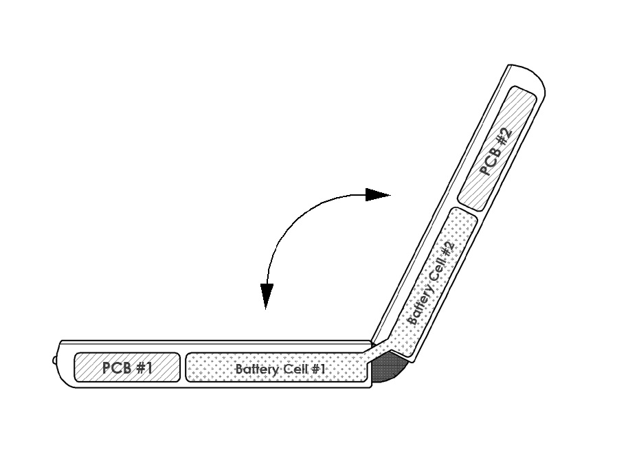 Hierbei geht es um einen Akku, dessen Zellen in zwei oder mehr Regionen aufgeteilt wurden aber mit einem biegsamen Steg jeweils miteinander verbunden sind. Dieser Steg wäre beispielsweise in einem Galaxy Fold oder Galaxy Z Flip (bei Amazon ab 1449 Euro erhältlich) über dem Scharnier verbaut, aber auch ein mehrfach-faltbarer Akku wäre prinzipiell möglich, wie die Zeichnungen unten am Beispiel eines Zick-Zack-Foldables mit Doppelscharnier zeigen.