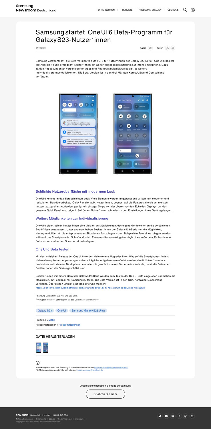 Samsung Deutschland hat in einer Pressemeldung angekündigt, dass der Beta-Test von One UI 6 auf Basis von Android 14 ab sofort verfügbar ist, diese anschließend aber wieder gelöscht. Der Technologiegigant aus Südkorea dürfte die Ankündigung wohl versehentlich etwas zu früh gemacht haben, dennoch bestätigt der Konzern damit die Details zum Start des Beta-Tests.
